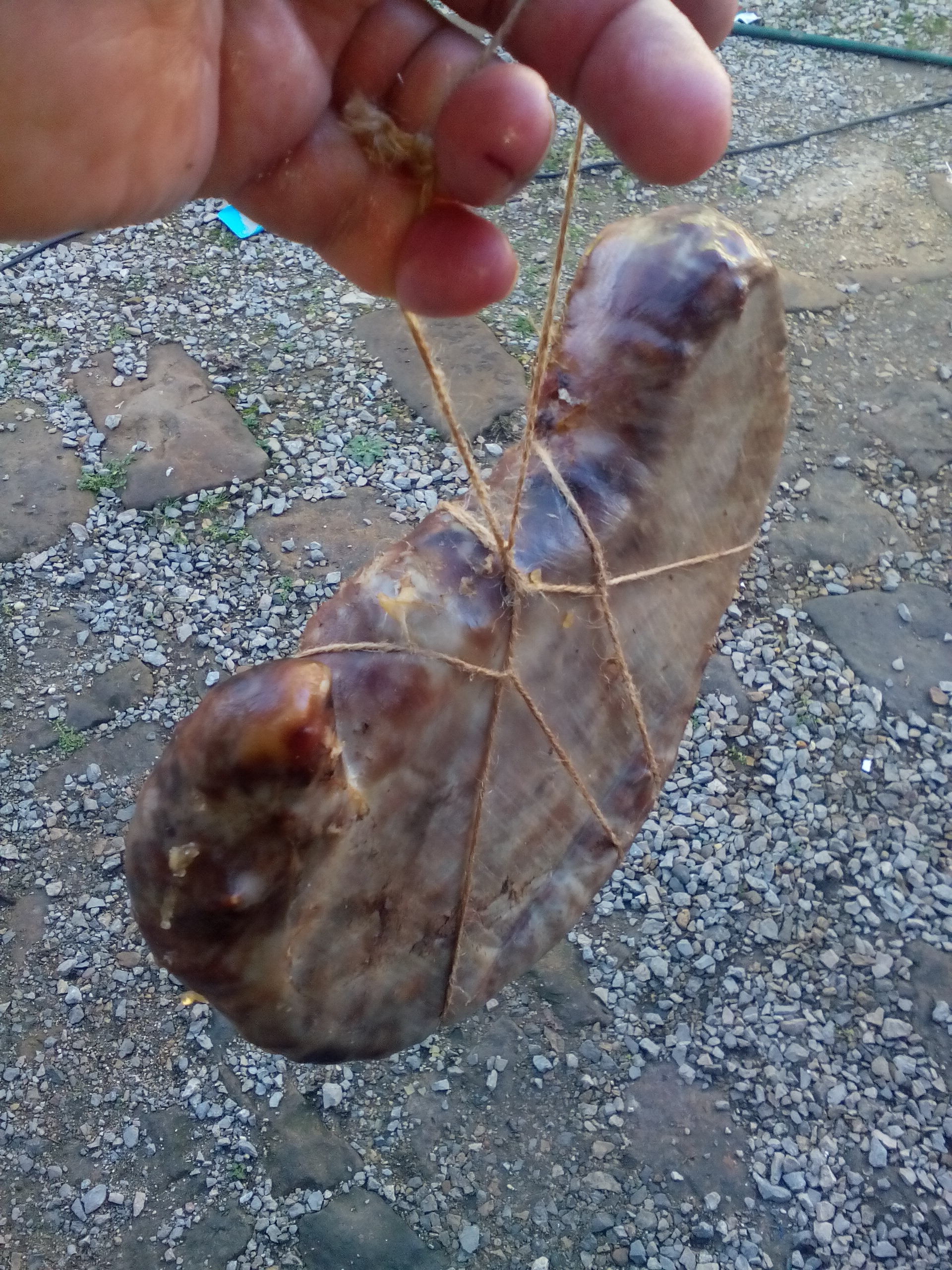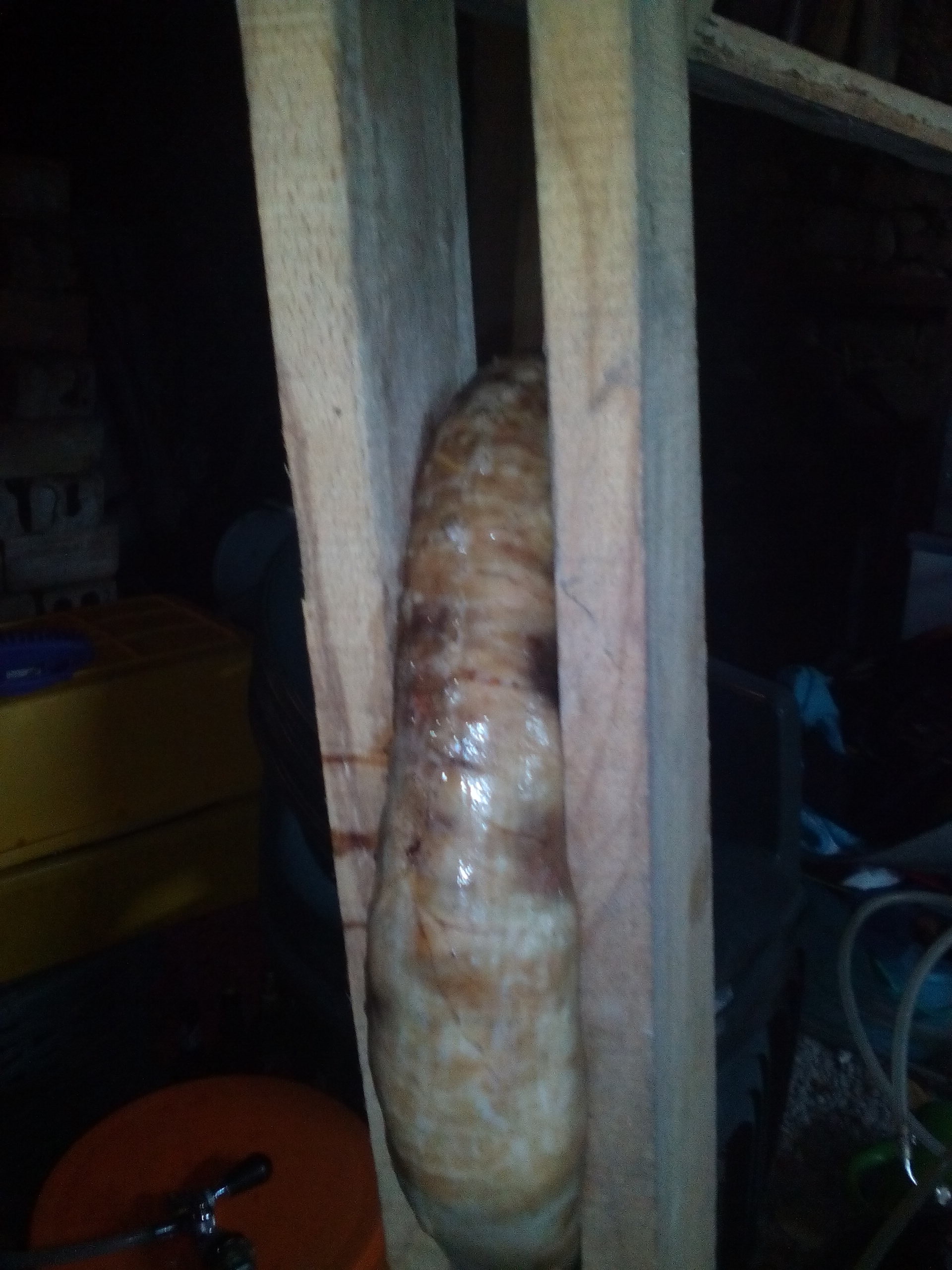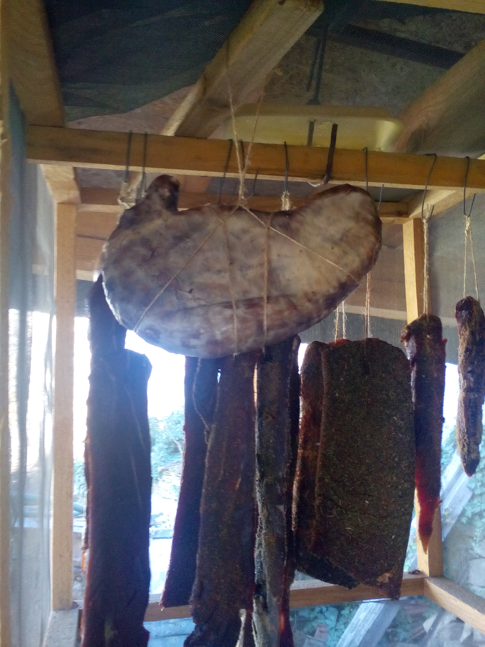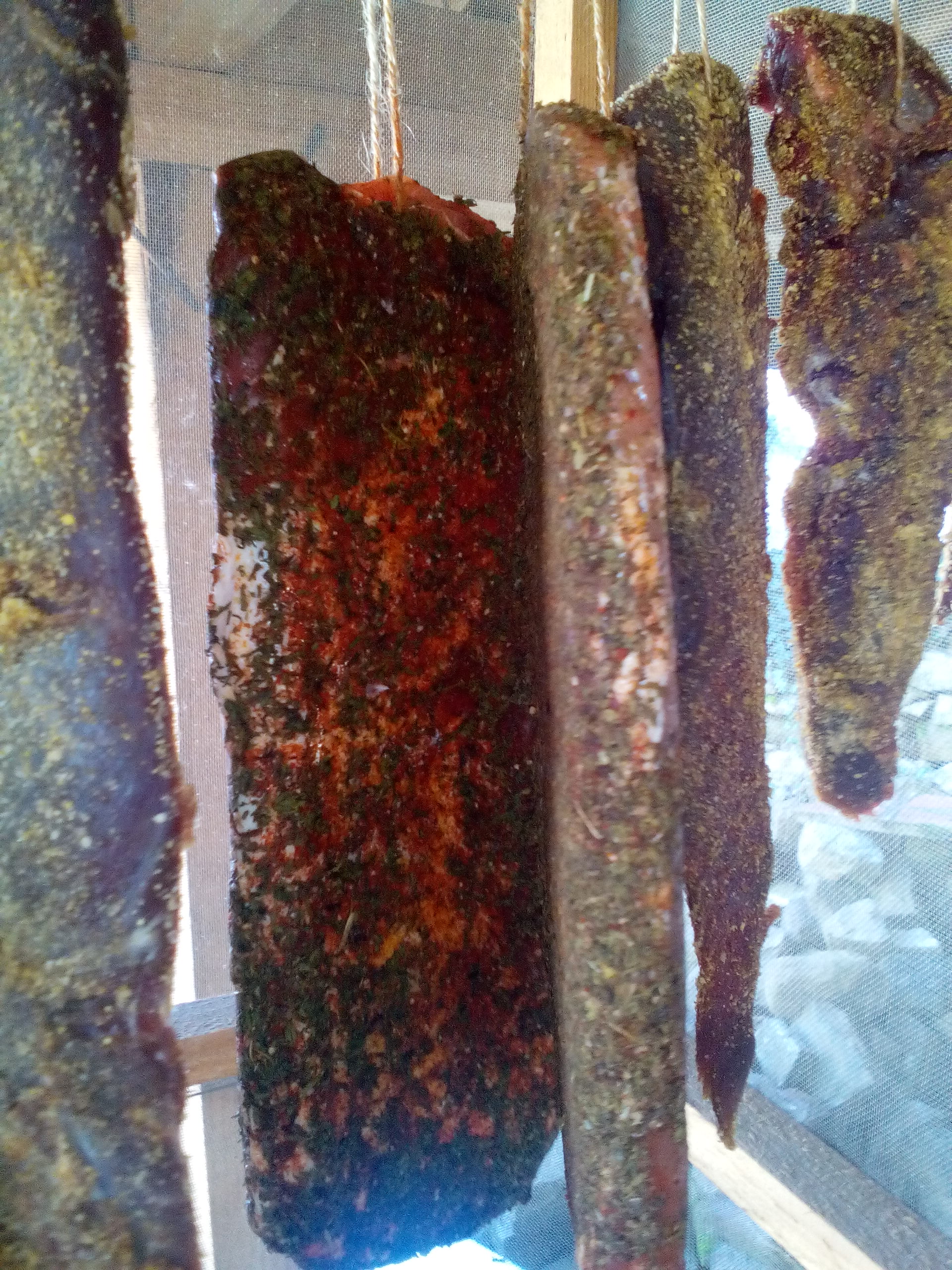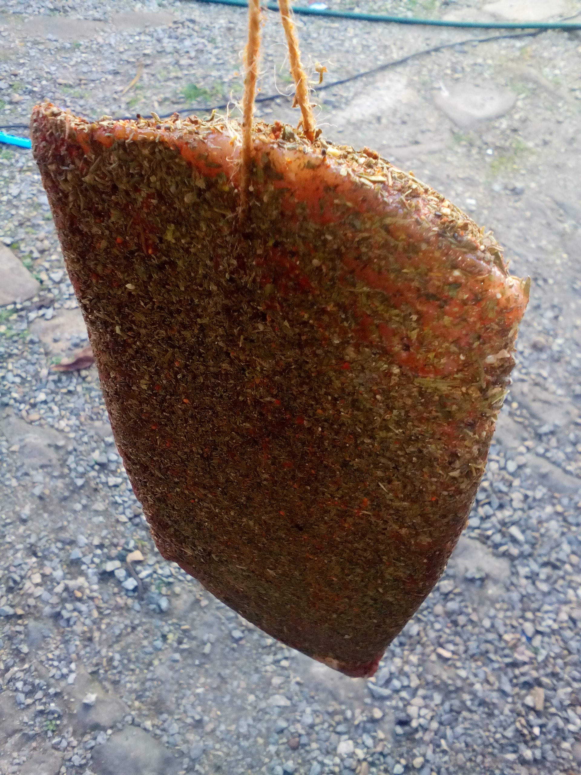 Dejmos, ако правилно разбирам осоляваш го 2-3 дни в /морска или обикновена сол?/ След това го мажеш с чесън, пипер и го държиш в хладилник 3 седмици и чак след това го опваш на простора?
