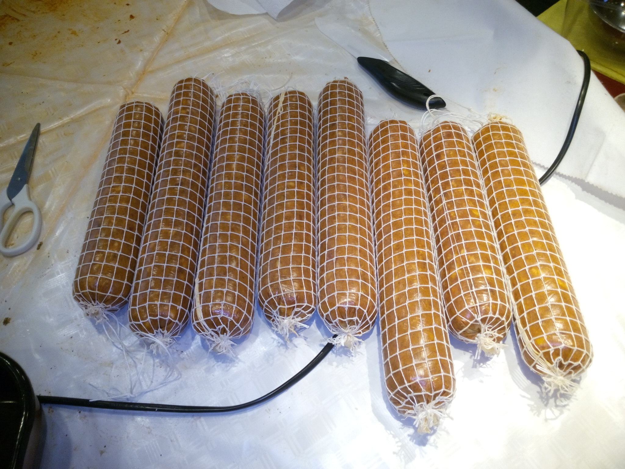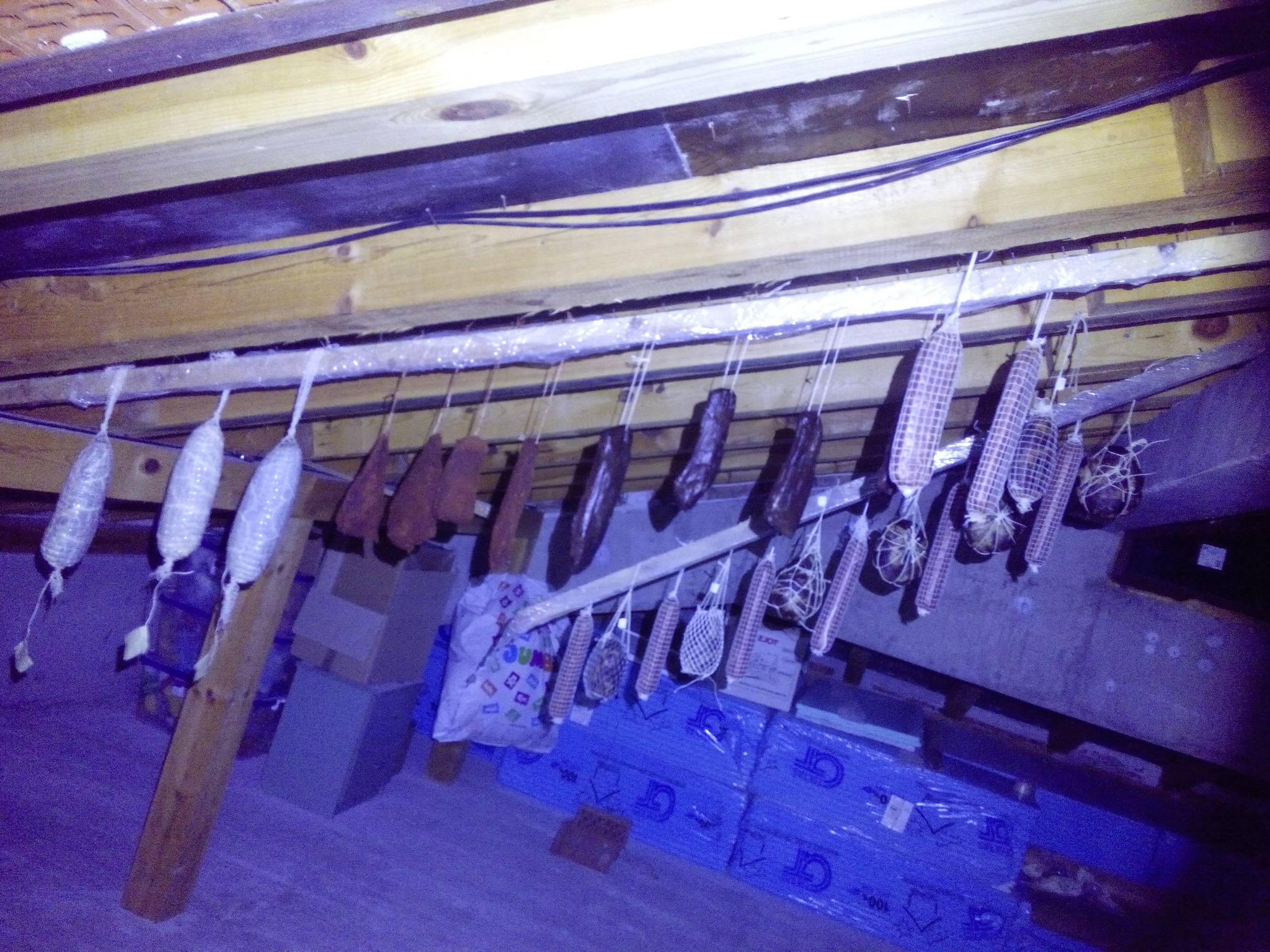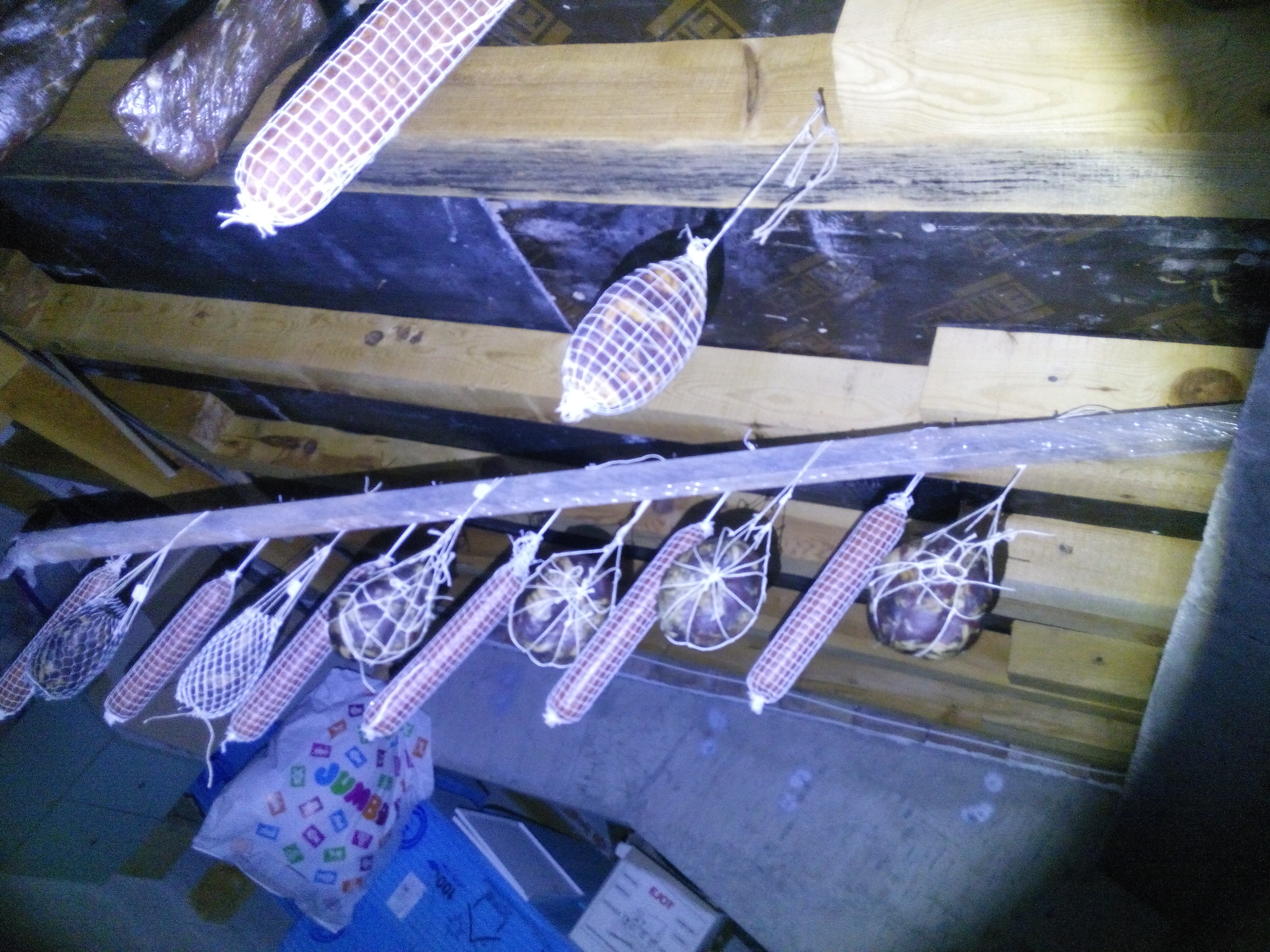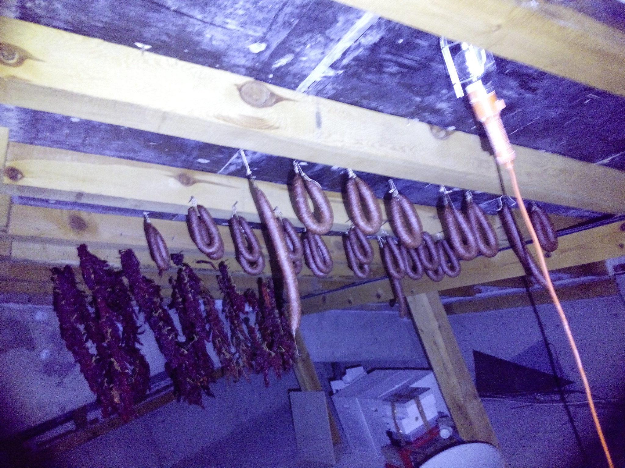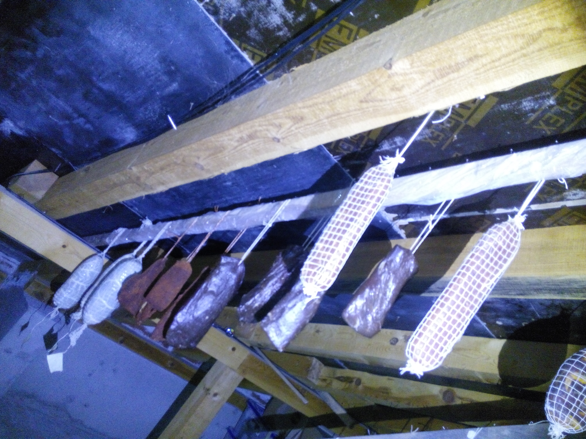 Понапълних тавана. 6 пуски, 1 бърсак, 8 чоризо, пастърми, 1 бресаола и 2 ролета "Трапезица" (общи около 24кг преди сушенето) . Плюс третата партида суджуци.