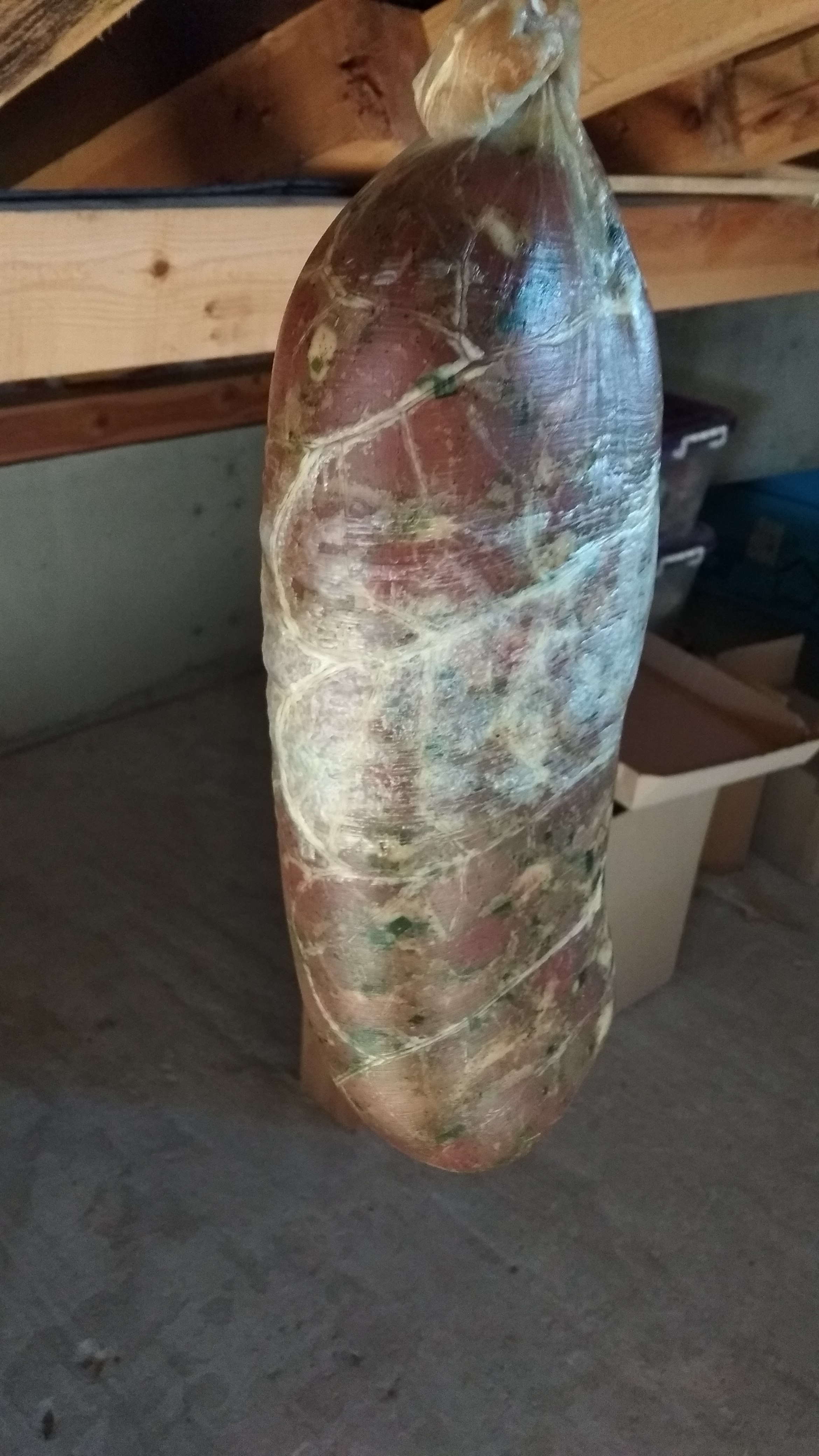 Червата се оказаха две. Напълних 2х2кг и с остатъка залепих шевовете. Много дебело черво, но еластично и покрива добре.