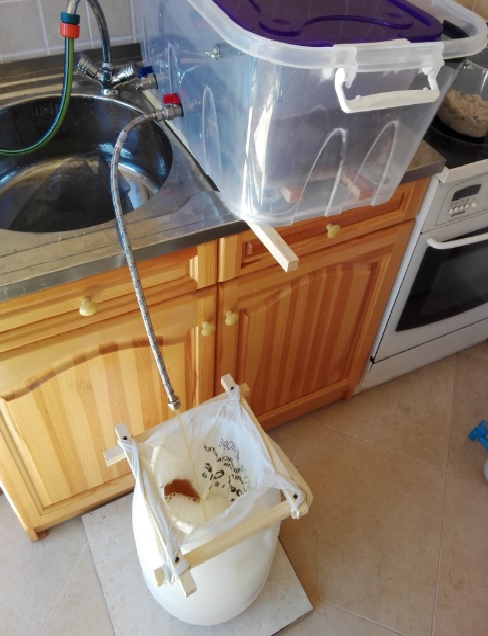 Това е друго мое приспособление-дървена рамка, която задържа торбата за финалното прецеждане.