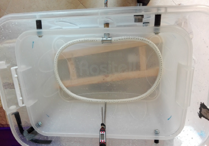 Докато събирах оборудване направих ПВЦ кутия за озахаряване, като я поставих в друга кутия за по-добра изолация с цел задържане на температурата по време на озахаряването, поставих и кран 3/8(червеният) за източване по време на промиването.Връзката между крана и тройника в по-малката кутия направих с удължител 3/8, фиксирах кутиите една за друга с 4 болта и тръба между двете кутии, под дъното на малката кутия направих дървена скара за да може да минава студена вода по време на охлаждането, на по-голямата кутия сложих и преливник ( под ръба на малката кутия за да не влиза вода в охлаждащата се мъст) и кран (синият ) за източване на студената вода след охлаждането.Кутиите са за хранителни продукти и издържат на температура до 106 градуса (така поне пише на етикета ), малката кутия е 30 литра а голямата 60.Това мое приспособление използвам както за озахаряване така и за промиване и охлаждане, по този начин отпада необходимостта от серпентина.Може да се направи и конфигурация с по-малки кутии спрямо варката.