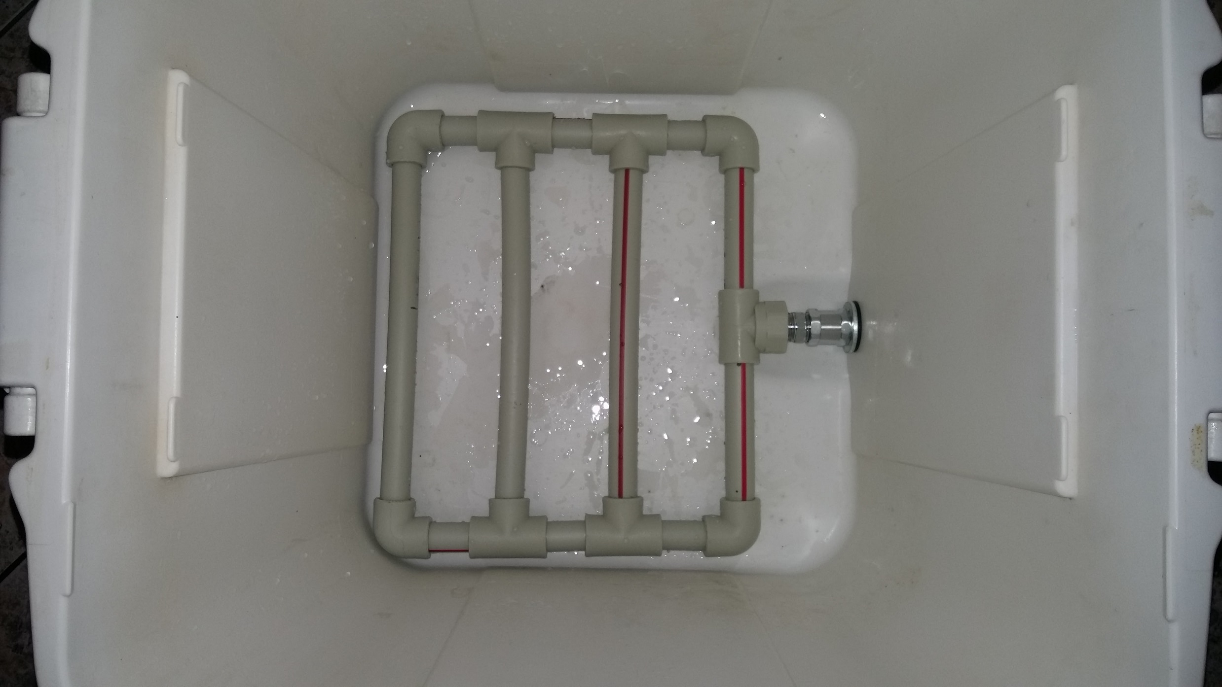 Тръбичката минава през дупката на Igloo-то, от вън е едно уплътнение, шайба, крана и щуцера. Отвътре е другото уплътнение и шайба, муфата и след това нипела. Използвах муфа и нипел, за да мога да затегна добре с муфата частта към крана, която е неподвижна, а с нипела навивам едновременно към муфата и Manifold, като там не е нужно да е плътно и стегнато за да може да се сваля и да се почиства, а и да пропуска не е проблем. Тествах системата, тече добре с чиста вода, няма течове около крана. Не съм затягал прекалено силно, за да не повредя Igloo-то. Тръбите ги рязах с зеге, както и отворите. Опитах с флекс, но се топи и стават прекалено големи отвори. Малко са неравномерно, но е трудно със зегето. Прикачих ги към тройниците и колената, като загрявах от всеки край на тръбичките и с клещи сгъвах , за да може да влезе. След това с един гумен чух ги сглобих (хич не беше лесно). Почистих остатъците(мустаците) от PVC с каквото намерих и накрая с една голяма пила. Дано съм бил полезен на някой :) Ето малко снимки: