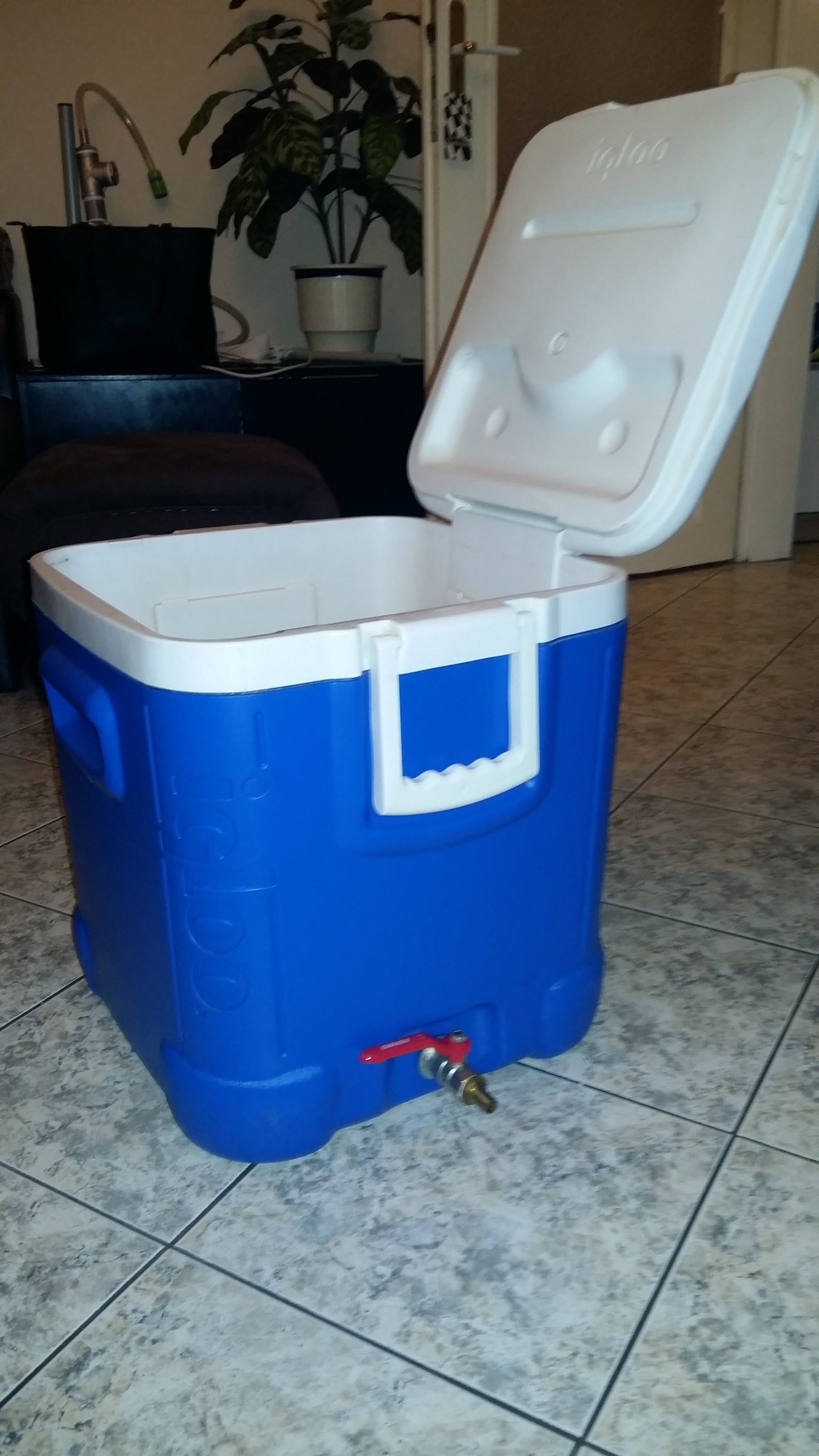 Новия MLT е готов, вчера успях да го сглобя. За да не пробивам по-голям отвор на Igloo-то, реших да използвам наличния 1/2 отвор за фабричната канела. Хладилната чанта е дебела и е трудно да се намери удължен нипел от подходящ материал. Затова използвах от тези щуцери за бидони 1/2, като отрязах планката и се получи тръбичка 1/2, дълга около 5-6 см, което е напълно достъпно. Ето какво използвах като материали за целия MLT: