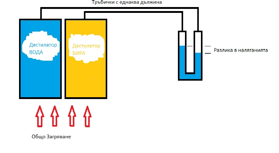 Следя също и форума rakiyata.com от където разбрах, че при дестилацията налягането в "аламбика" се покачва (макар и не с много). Така, че ако Виктор успее да направи двете "мини казанчета" еднакви, то по разликата в наляганията (в установен режим на дестилация) ще може да се определи алкохолното съдържание в бирата (или виното). Прикачам и една схемичка за онагледяване на идеята. За "тарирането" на уреда мисля, че е ясно - с предварително приготвени точни проби с алкохол, разтворен в тях (1%, 2% и т.н. до примерно 25%). Следователно трябва да се направят поне 25 "изварявания" и да се направи скала, която да се закрепи за двете пълни с оцветена вода тръбички.