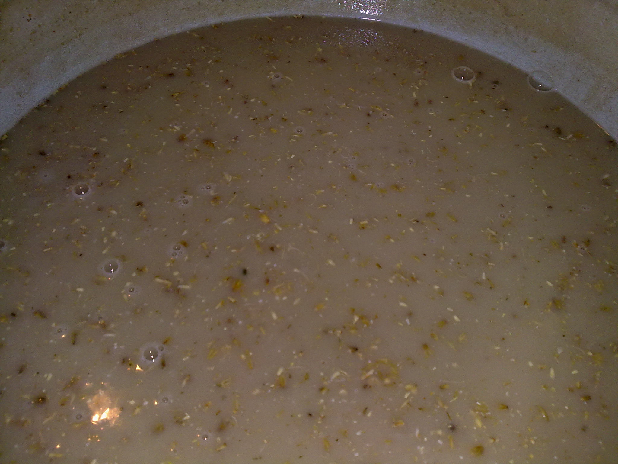 изплакнах по голямата тенжера пресипах мъстта вътре и започнах варката. Завря си пусна пяната след около 10-15 мин сложих горчивия хмел и продължих варенето. Варя си аз варя и по едно време изненада :shock: часовника спрял :) и съм варил бирата 2 часа :geek: . Сложих ароматния хмел и поварих още 10 мин. Йодната проба грам не си мръдна цвета след яката варка.