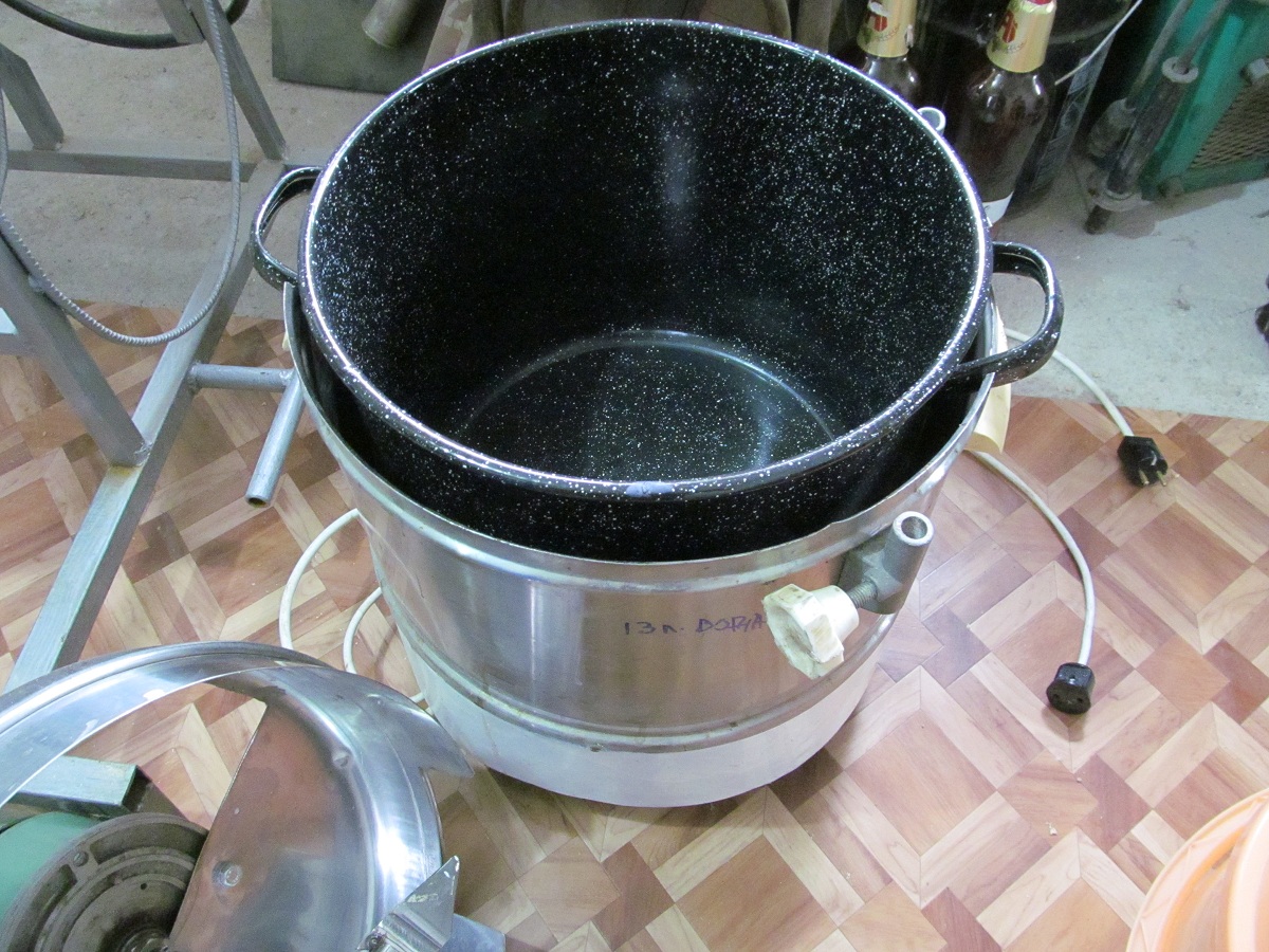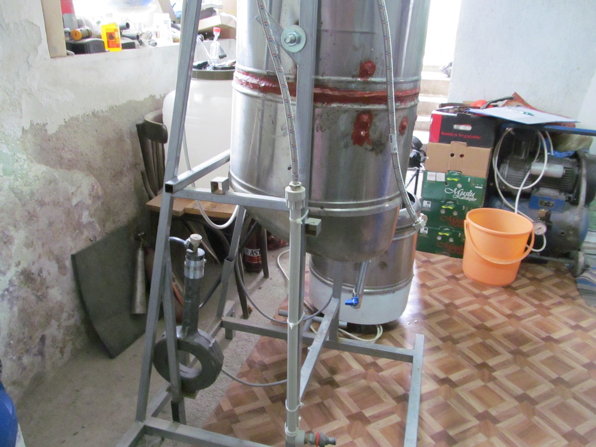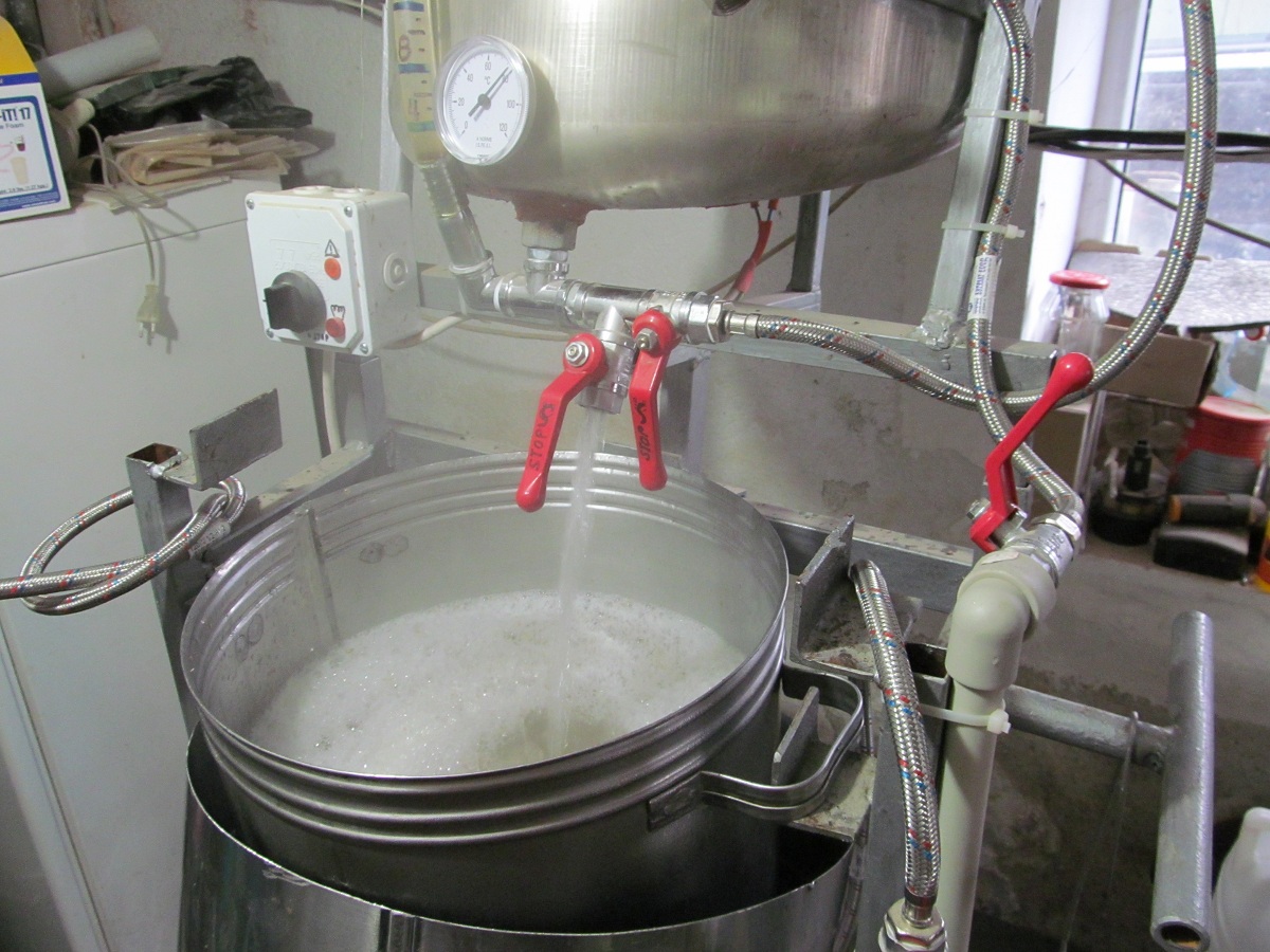 А ето го и казана със съда за промиване и прецеждане, идеята на наклоненото дъно е като приключи варенето и течноста се отаи първо източвам утайките и след това останалото.