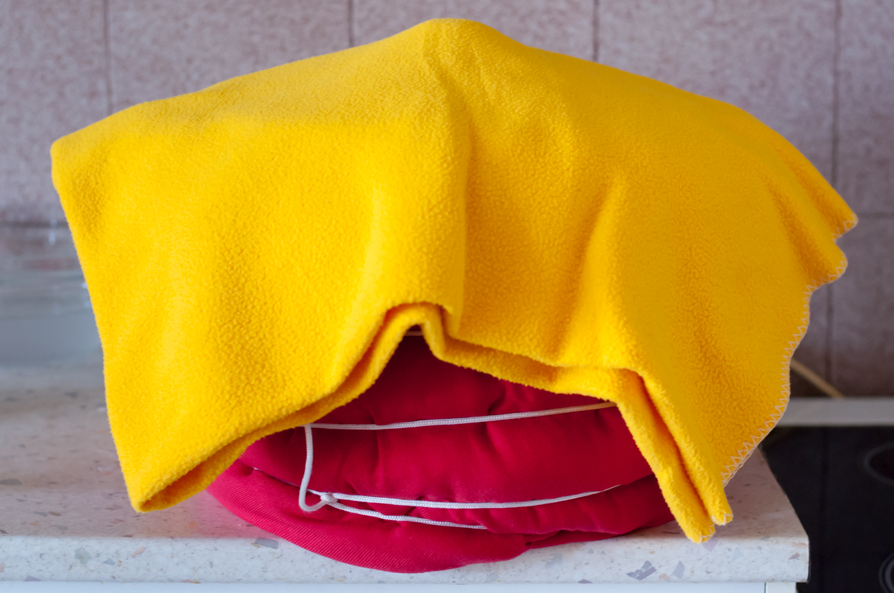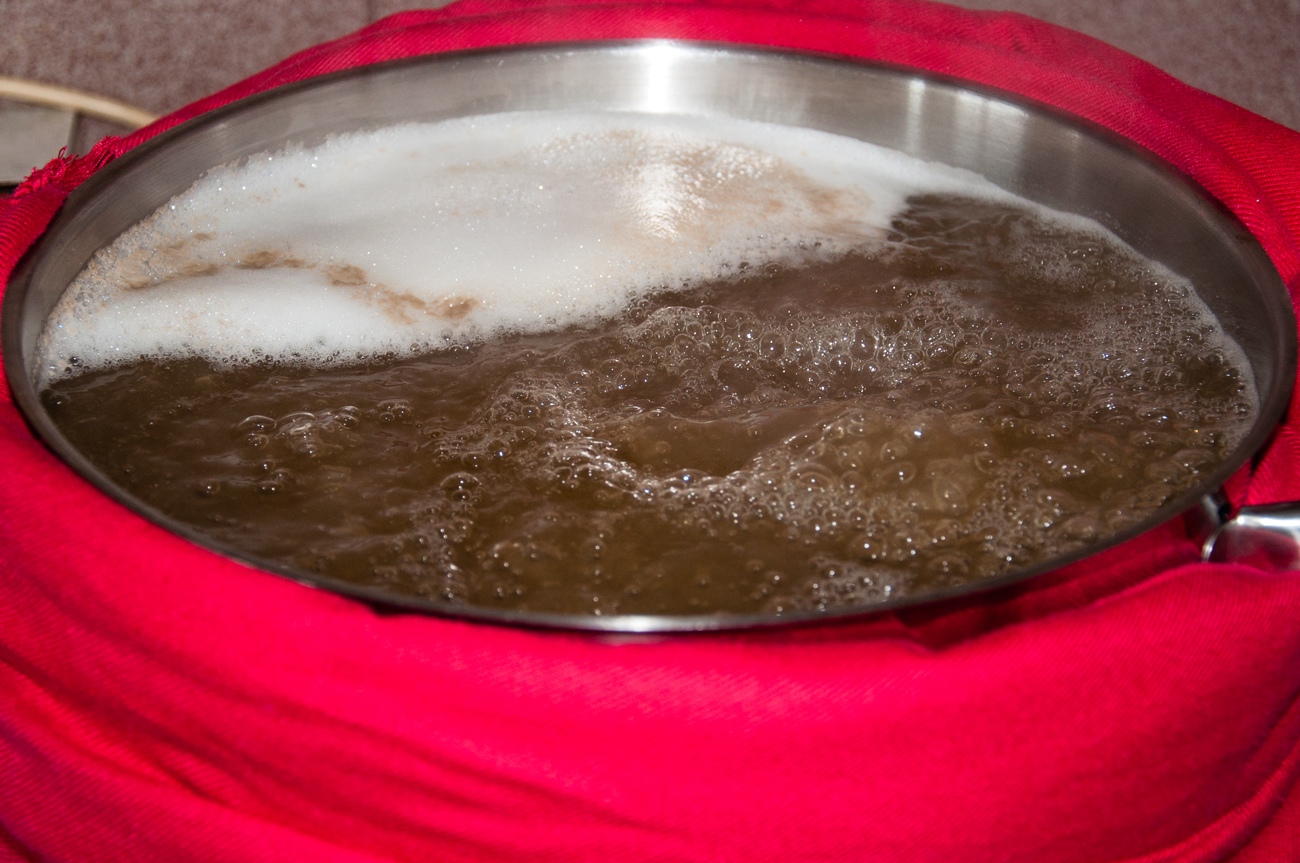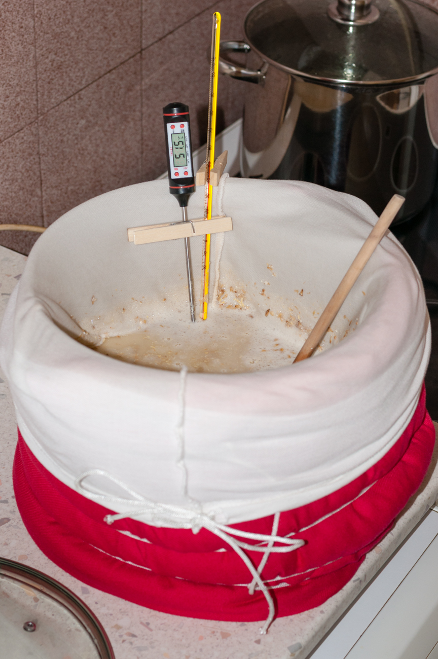 • започвам загряване до основната температура за озахаряване (според рецептата); когато е готово, махам тенджерата от котлона, завивам я добре и оставям настрана за необходимото време (пак според рецептата); в моя случай температурата пада с 3-4 ℃ за един час, но може да се направи и по-добра топлоизолация;