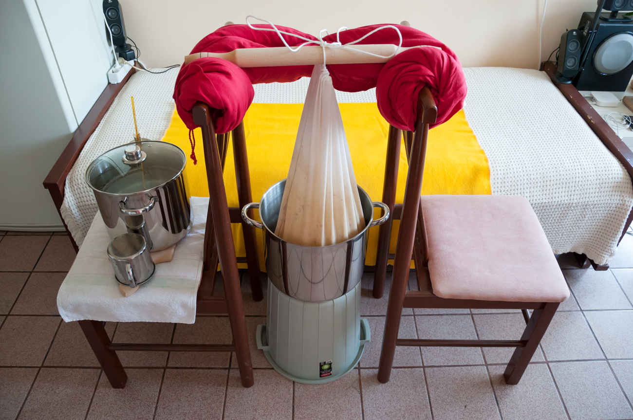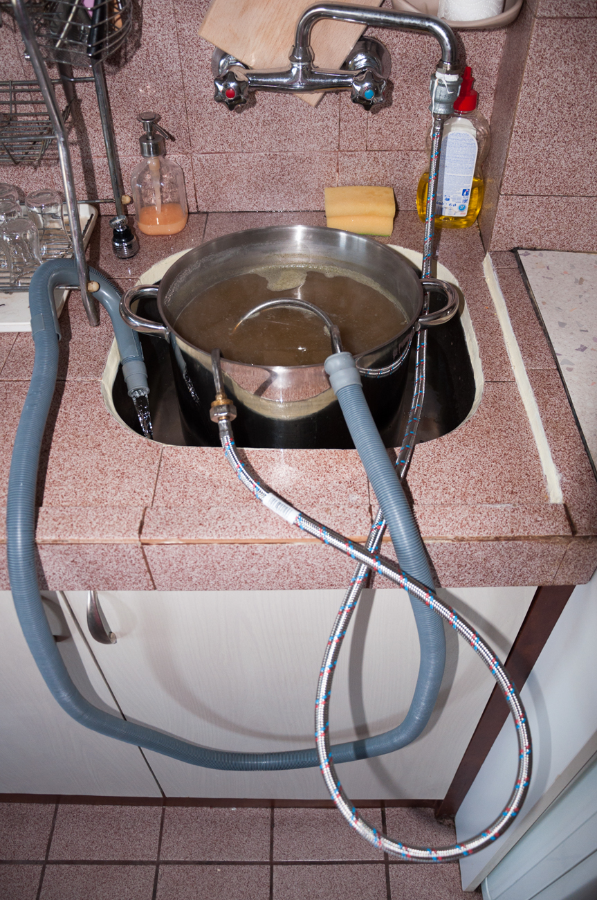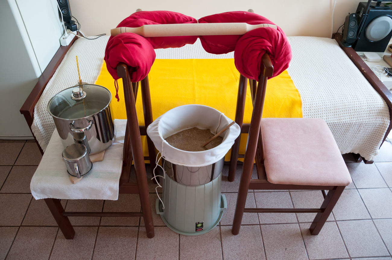 • варианта, който предпочитам, е с частично промиване и се вижда на снимките – докато торбата се отцежда, доливам вода през горния отвор; обикновено не използвам цялата вода, а изчаквам да се съберат около 10 л и слагам да завира, след което доливам до 13 л; всичко това се случва за около 30 мин;