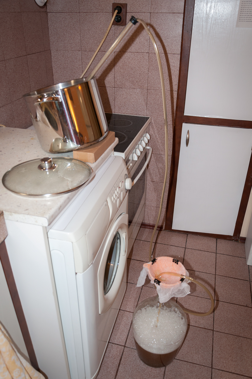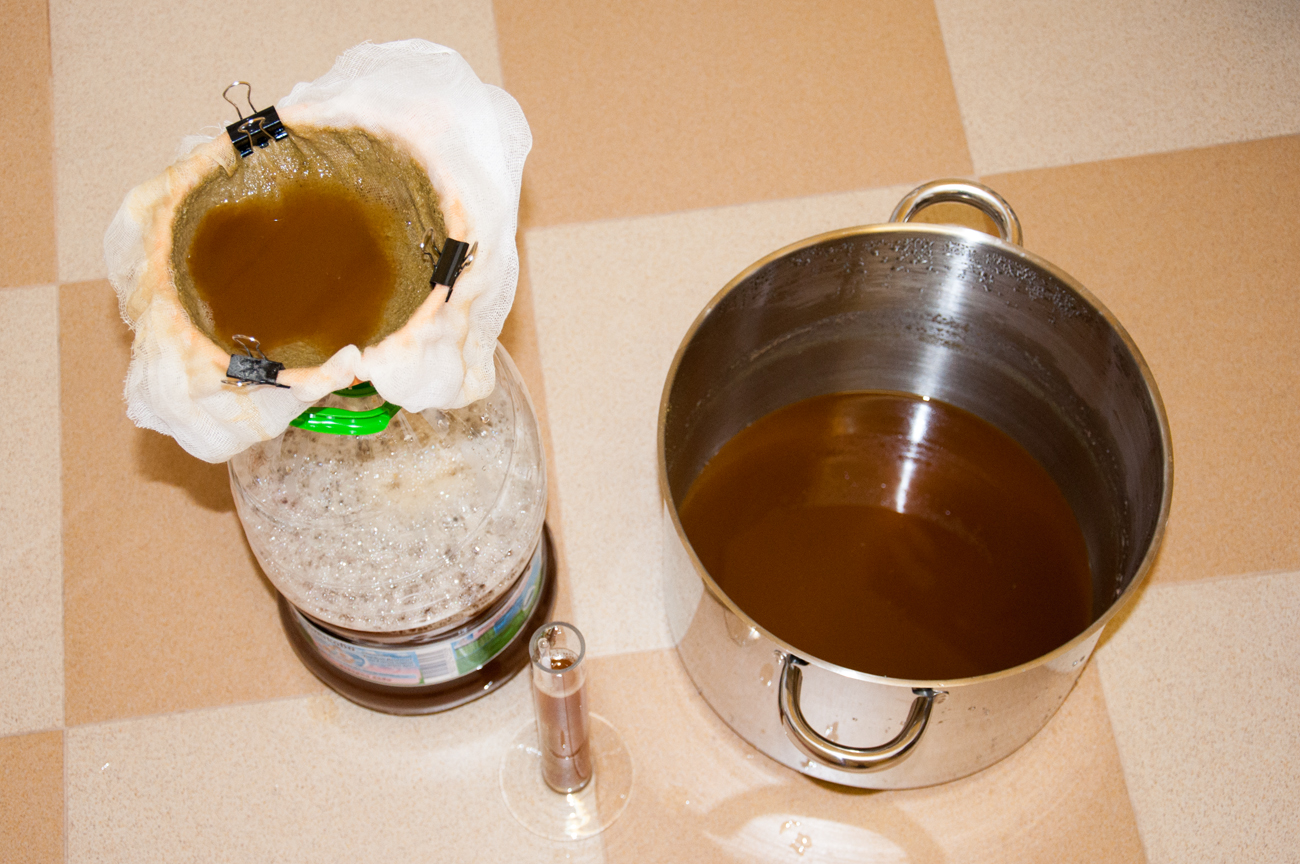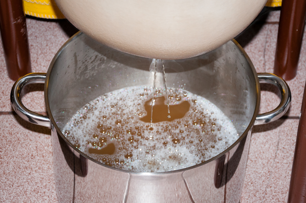 • прехвърлям преварената вода в друг съд – ферментатора и по-малката тенджера, например; изхвърлям каквото се е утаило на дъното;