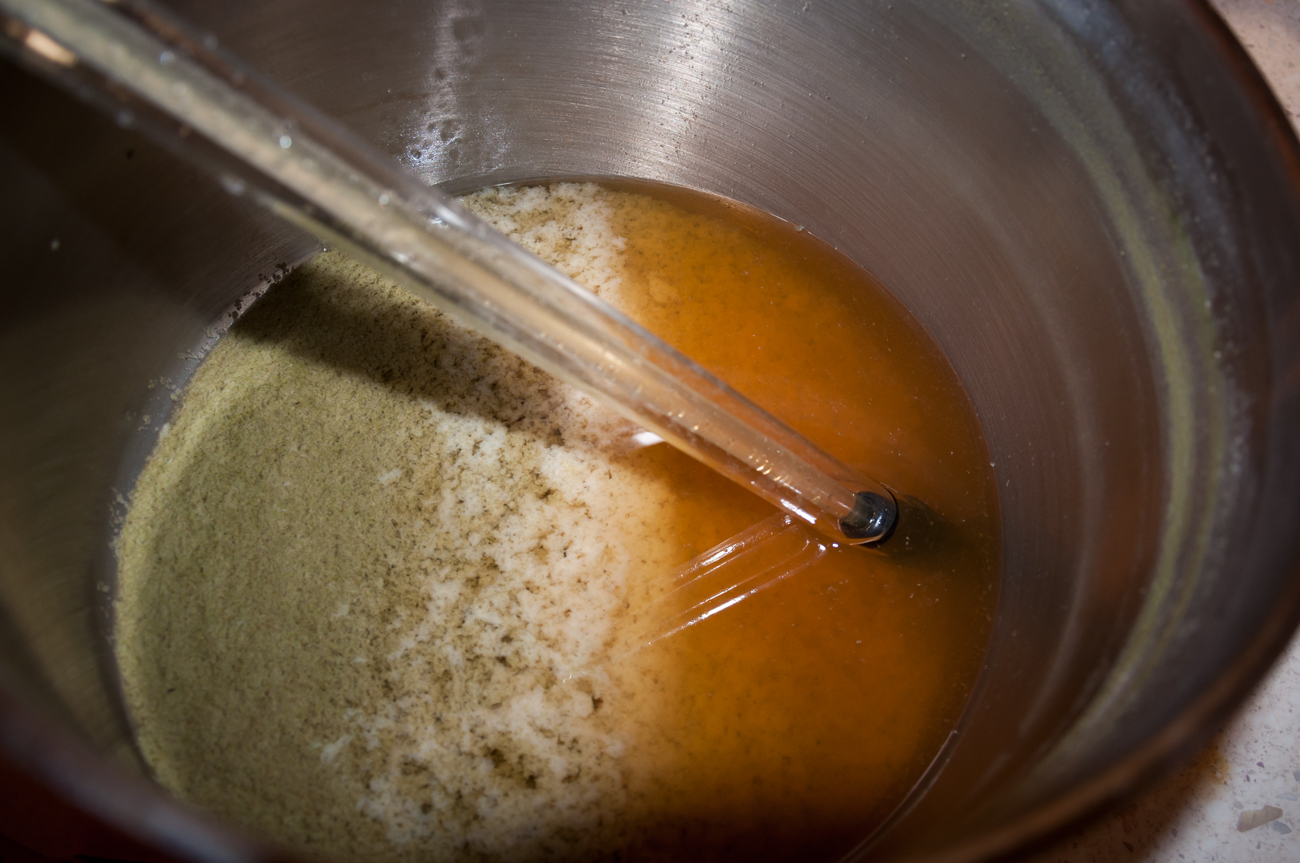 • междувременно слагам останалата вода (водата за промиване) да се загрява в малката тенджера; проверявам от време на време температурата, като целя в края на озахаряването да е около 78 ℃;
