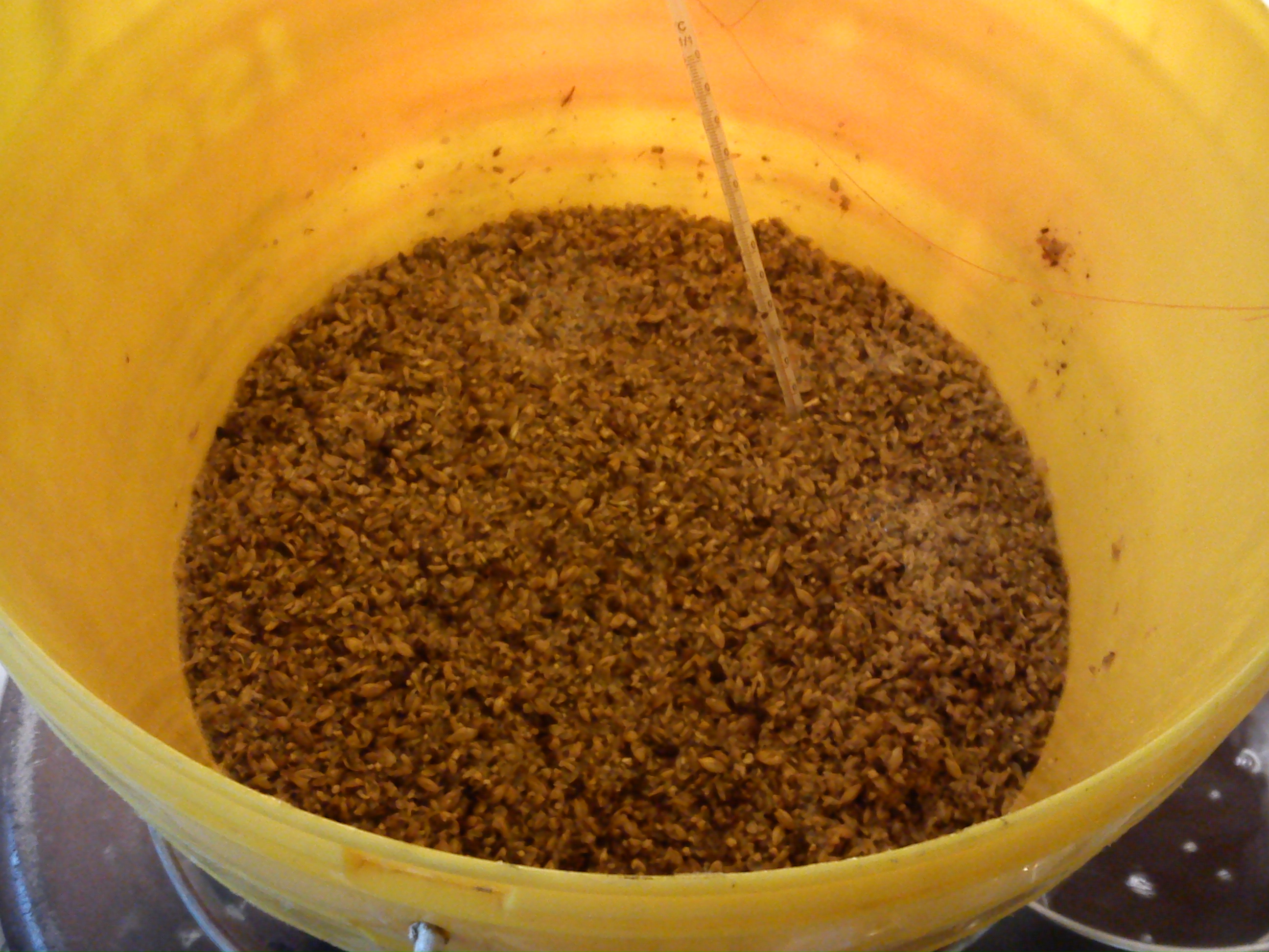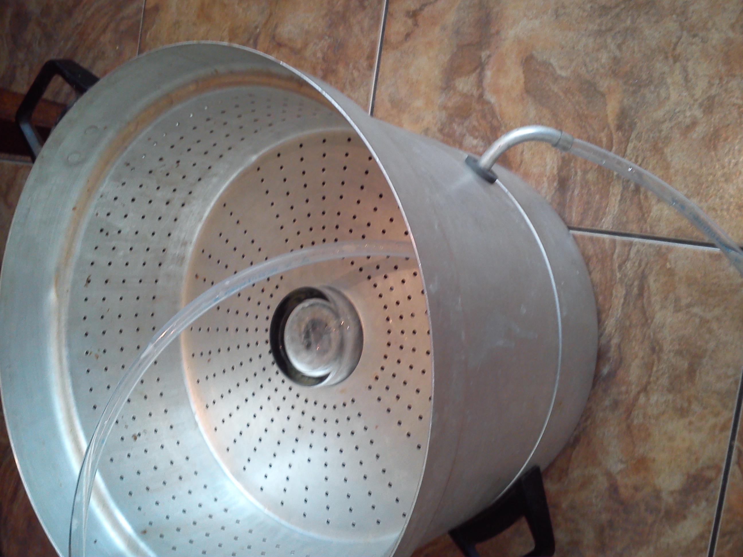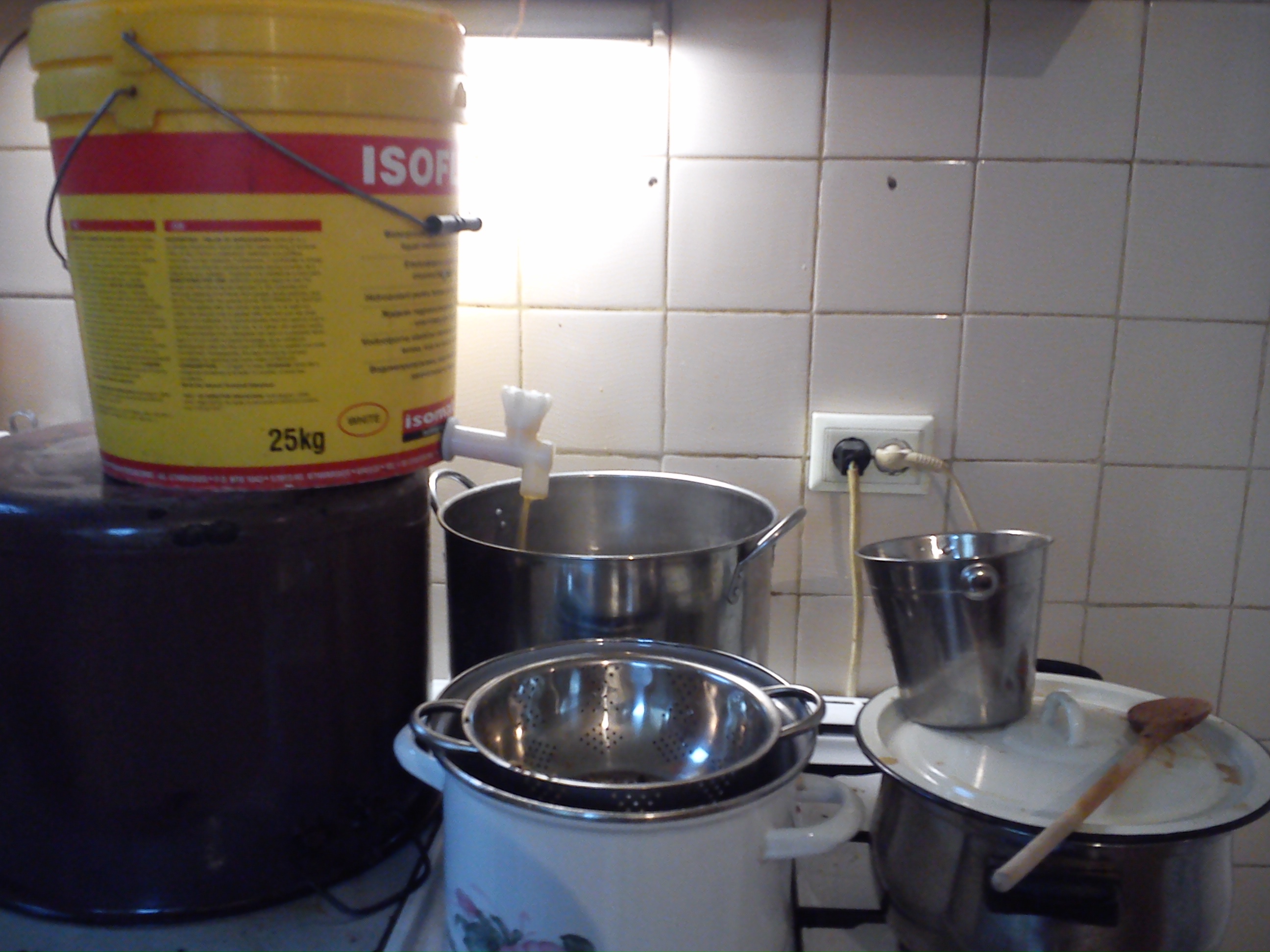 Смесих малца с водата на 50*, температурата падна до 45* там държах 15 минути, покачване до 53* там пауза 20 минути, покачване до 67* и задържане 40 минути, след това 72-3* градуса за още 15 минути и на 77* градуса започнах прецеждането и промиването с вече затоплена до 78* - 8 литра вода. Извадих късмет, защото вкъщи намерих една стара тенджера с двойно дъно, решетка и канелчица, който използвах за промиването. По време на процеса известно количество от мъстта отиде на плочките, защото не бях прикрепил маркуча никъде и от налягането беше избягал от тенджерата в която събирах течността