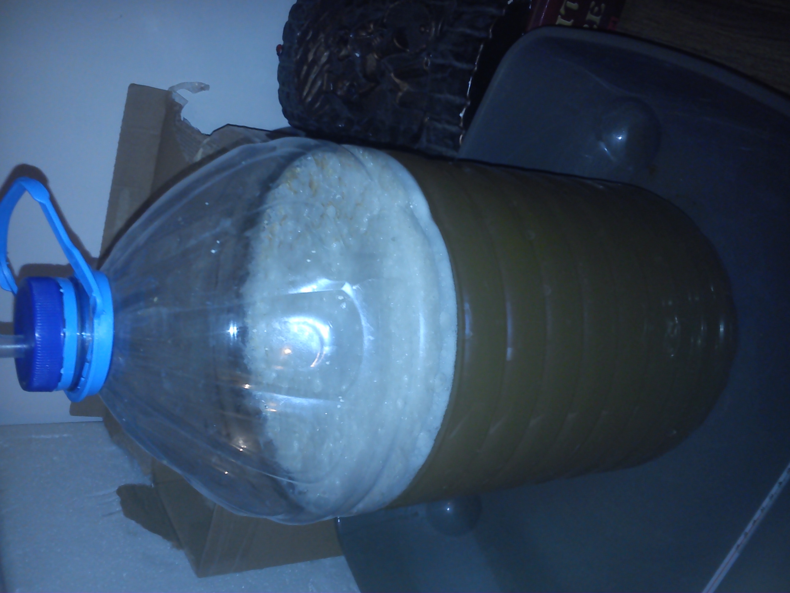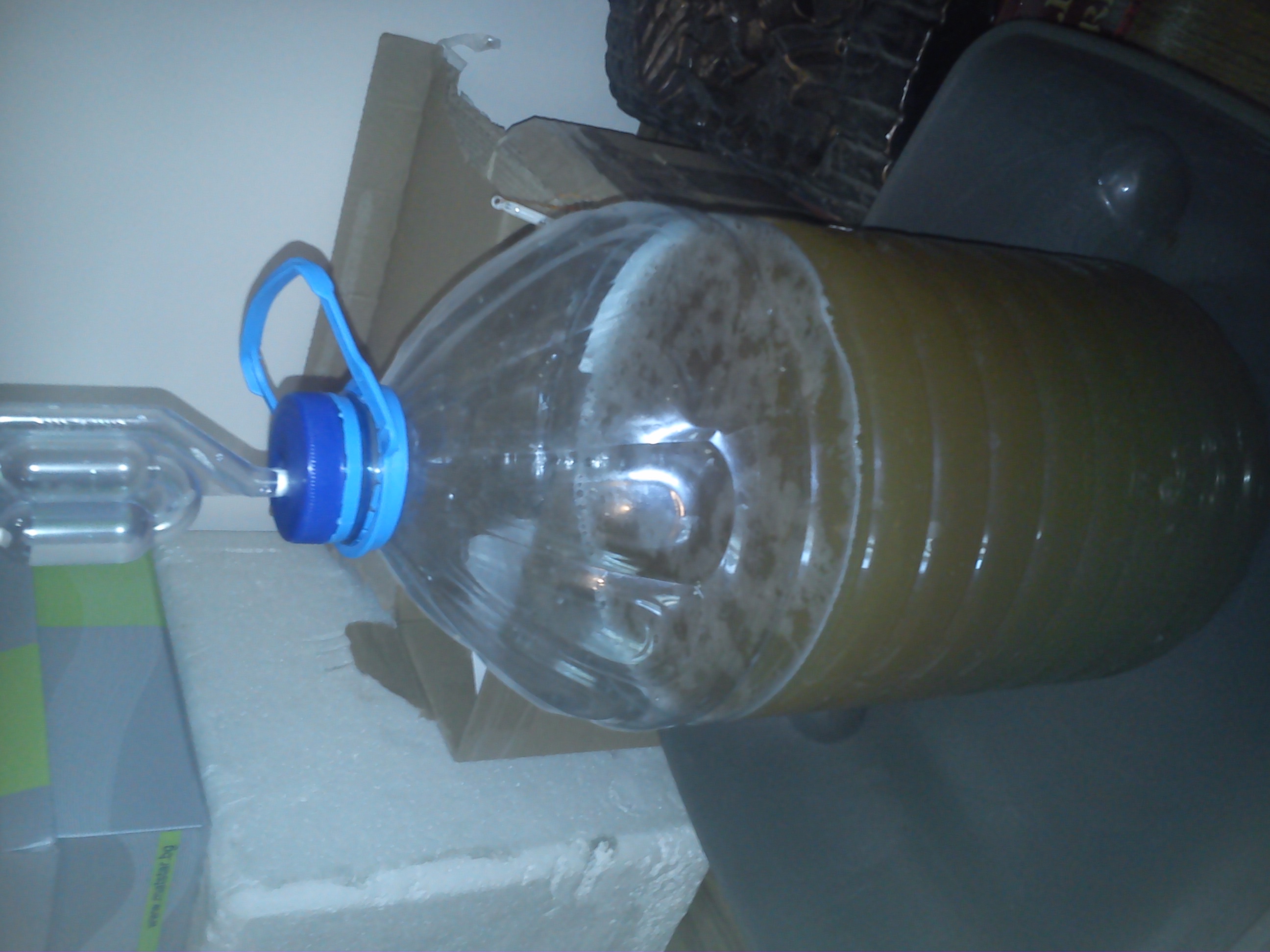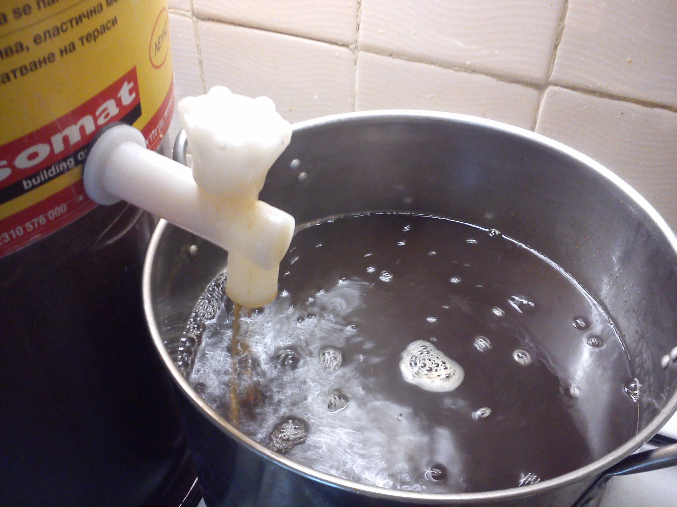 Тъй- като ползвах електрически котлон времето за завиране беше около 50 минути ( тук е мястото да кажа, че след прецеждането температурата на мъстта падна до 65*) и нямаше врене с ключ. След първите 10 минути сложих 30 грама хмел, а в последните 10 добавих останалото количество, в случая 10 грама ( имам приятел, който работи в заложна къща и при него измерих точния грамаж на хмела и дрождите). охладих до 27-8* на водна баня - процеса отне около 30 минути, и лед това започнах да прецеждам през марля, това отне около час. На дъното остана към литър тиня, която не се мъчих да прецеждам. Получи се към 8 литра мъст. Аерирах със силно разклащане и изсипах дрождите без да ги активирам във ферментора (10 литрова туба от мин.вода) сложих водния клапан и зачаках.