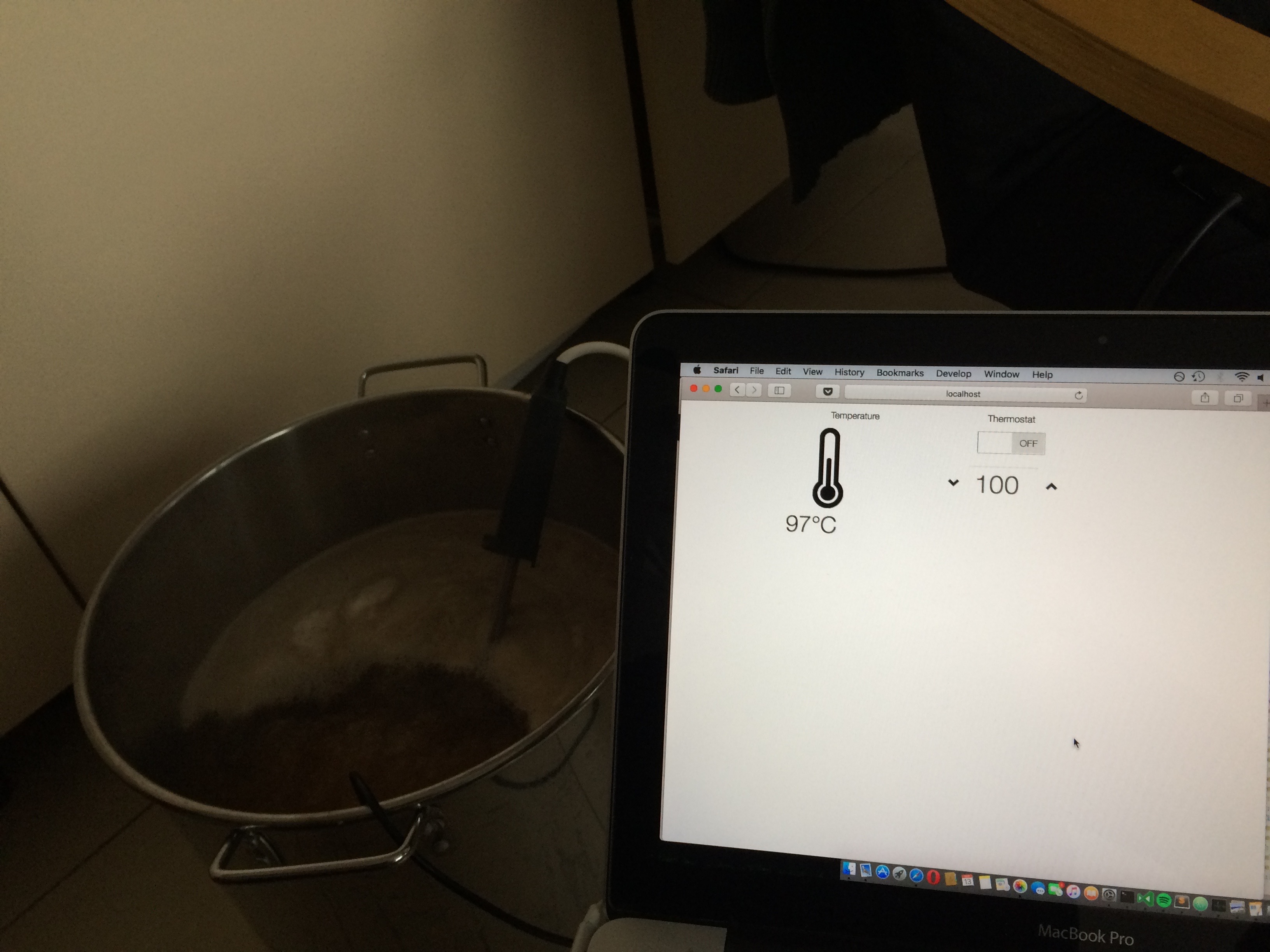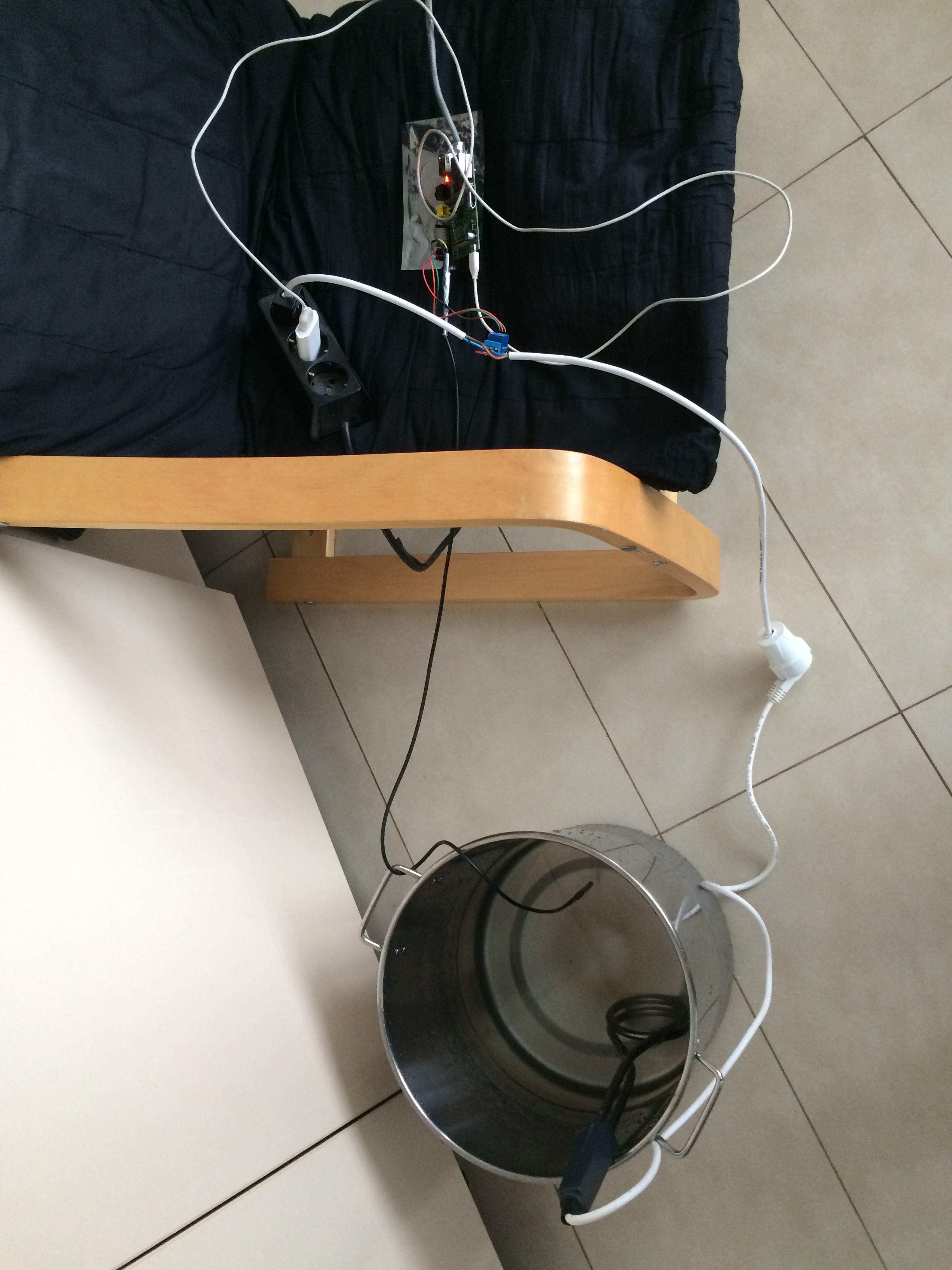При третия опит реших да оптимизирам процеса и използвах бързовар включен през реле свързано с Raspberry Pi към което има и свързан термометър. Написах и малко програмче на Node.js, което следи температурата на водата и пуска/спира бързовара през релето когато е нужно.