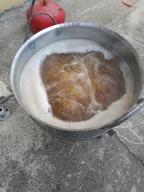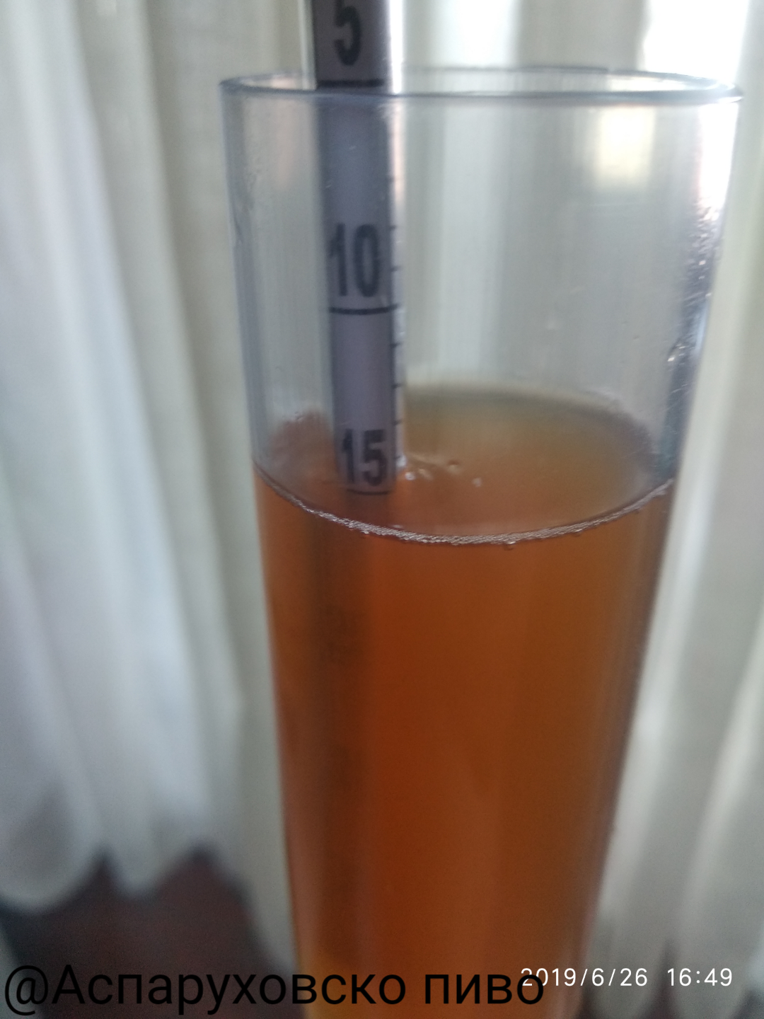 Измерванията са направени с домашен битов захаромер. Варене в широка и ниска тава, самоделка от едновременна пералня Роса, като на 15 мин след завирането е добавен 15 гр. хмел Жатец и на 1 час и 15 мин още толкова Жатец. Варенето е 1 час и 30 мин.