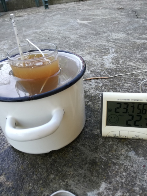 който беше залят с 6 литра вода на 74 гр. по Целзий. Сместа бе изсипана в предварително подготвена хладилна чанта и престоя там 45 мин.