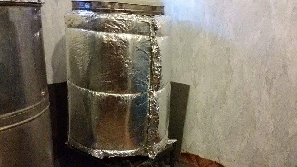 Последно я тествах с 46л. вода и 20кг. малц и с повече вода за промиване тече си без никакъв проблем даже намалям да тече по бавно за по добро промиване. Изолиран е с каменна вата с алуминиево фолио.