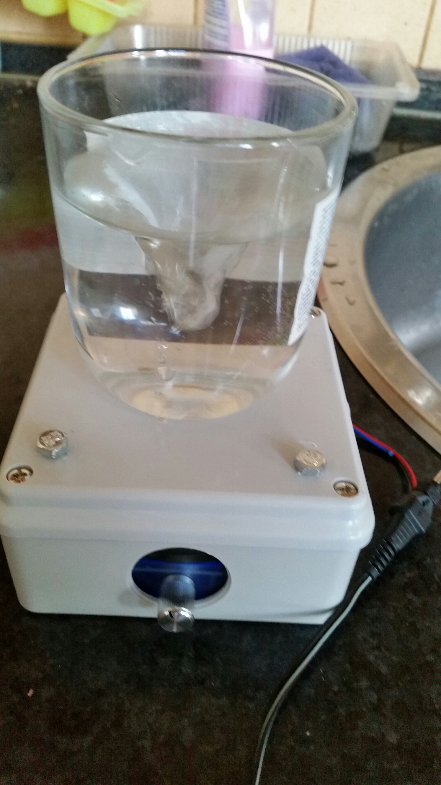 Така. Направих една импровизирана установка. Има надежда :D . Установих, че вентилатора който използвам е слаб. Ще трябва друг. И другото което е - трябва да се експериментира с дължината и диаметъра на самата бъркалка за постигане на оптимален ефект. В момента използвам желязна бъркалка с дължина 20мм и диаметър 3,5мм. Но дори и така в съда с вода ( а после и дрожди надявам се) се получава хубаво завихряне - чак до дъното. :dance: