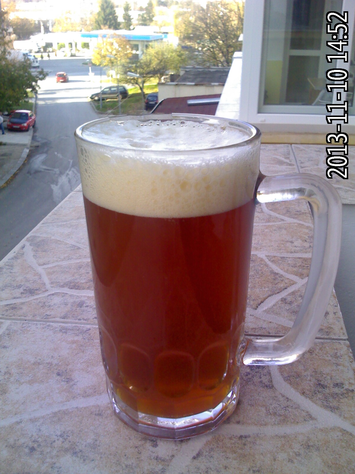 Последната амбърка - точена от кега на две седмици след старта на ферментацията ! Голям кеф ! И на малките дадохме да опитат. Голямата горчивина леко се замазва от малцовия вкус. Пяната е добра, след като поспадне се задържа на слой от около 2 мм. и така си стои дълго.