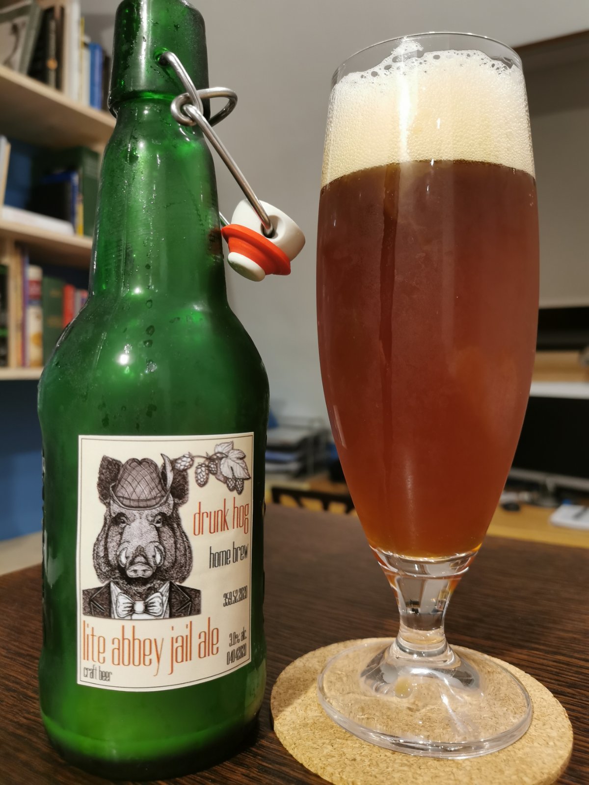 Плътно тяло, аромат на карамел, хмела се усеща леко. Има лееек кисел вкус, който изчезва, сравнено с пробата ми от 3-тия ден при отлежаването. Пяната при сипване се получава добре, но изчезва бързо. При развъртане на чашата лесно се образува нова. Газировката е лека, нарочно търсех по-ниска и съм сложил бяла захар 5.5 гр/л. Определено има лек дъх на дрожди, от стоенето във ферментатора 12 дни, но не дразни. Послевкусът (след оригване ;) е на хмел, което на мен ми допада. Цветът е по-тъмен от колкото очаквах, бистра е, нищо не плува вътре :) Леко алкохолна, около 3%, което се оказа плюс в крайна сметка от гледна точка на женските членове на семейството :)