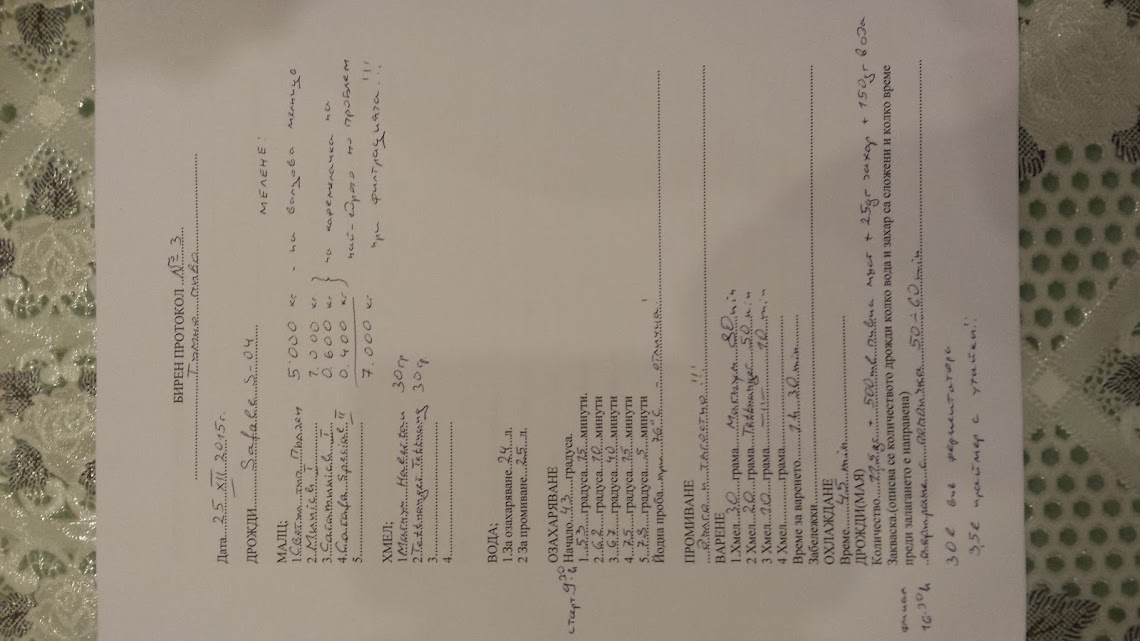 и дрожди с долна ферментация Saflager W -34/70 - 11.5 gr. стартирани 3 ч. с 15 град. пивна мъст.