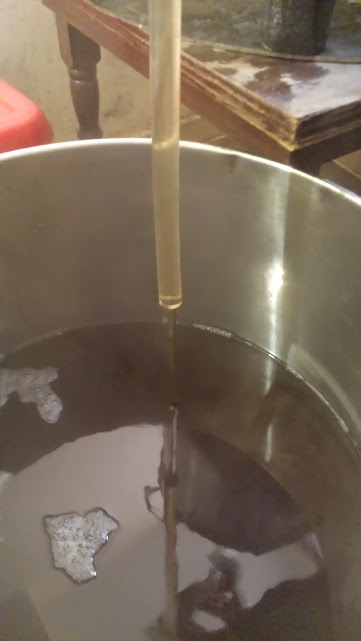 Водата естествено подмина предвидените 45 град и стигна 56. Нищо вадя 2.5 л - добавям толкова студена, после още веднъж същото упражнение, нагаждам на 46град, смесвам, разбърквам, добавям 3 куб.см. млечна киселина със спринцовка, правя замерване след охлаждане - Ph 6.