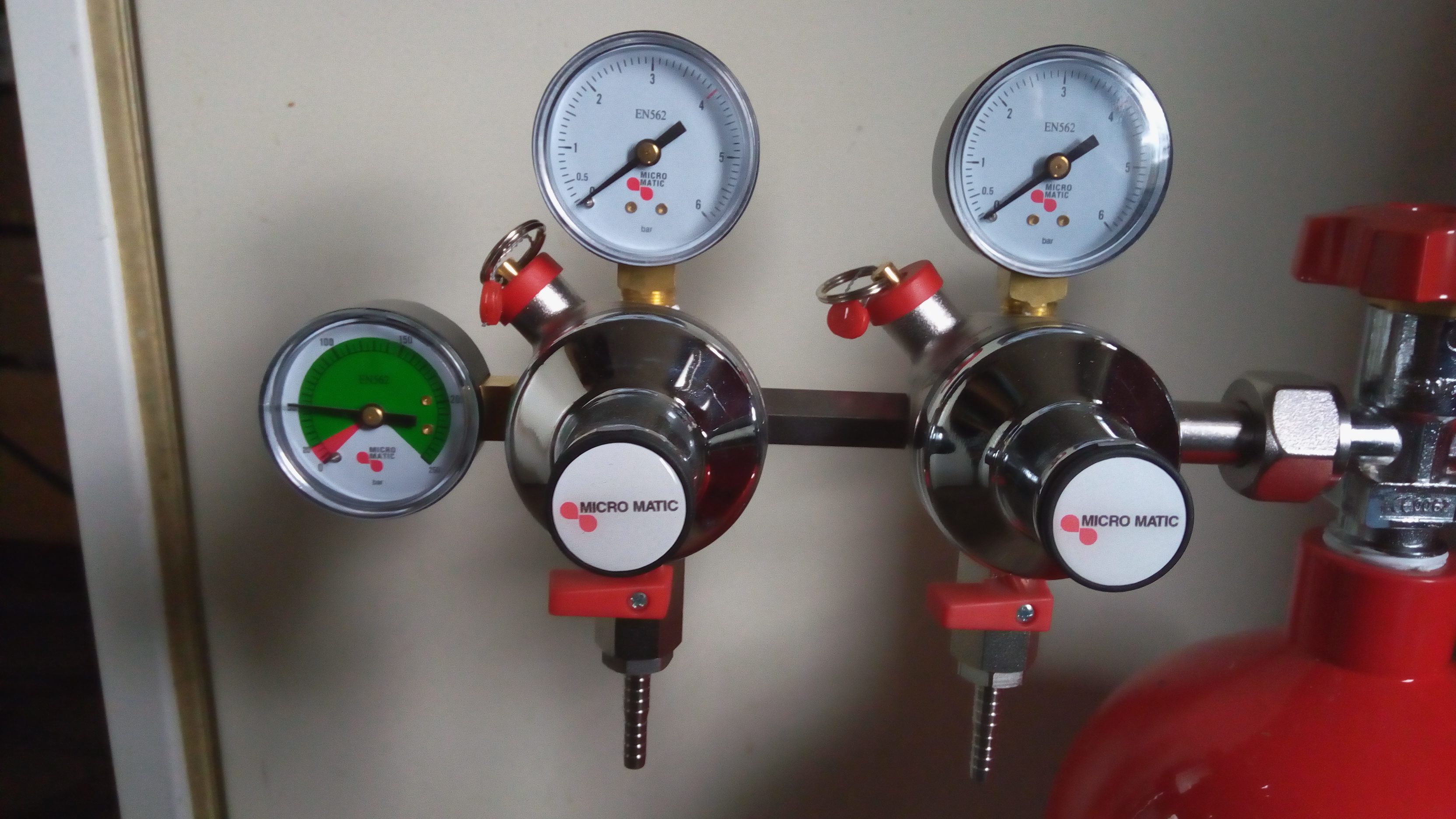 Ето и редуцир - вентила, с който двата кега могат да се надуват с различно налягане, независимо един от друг: