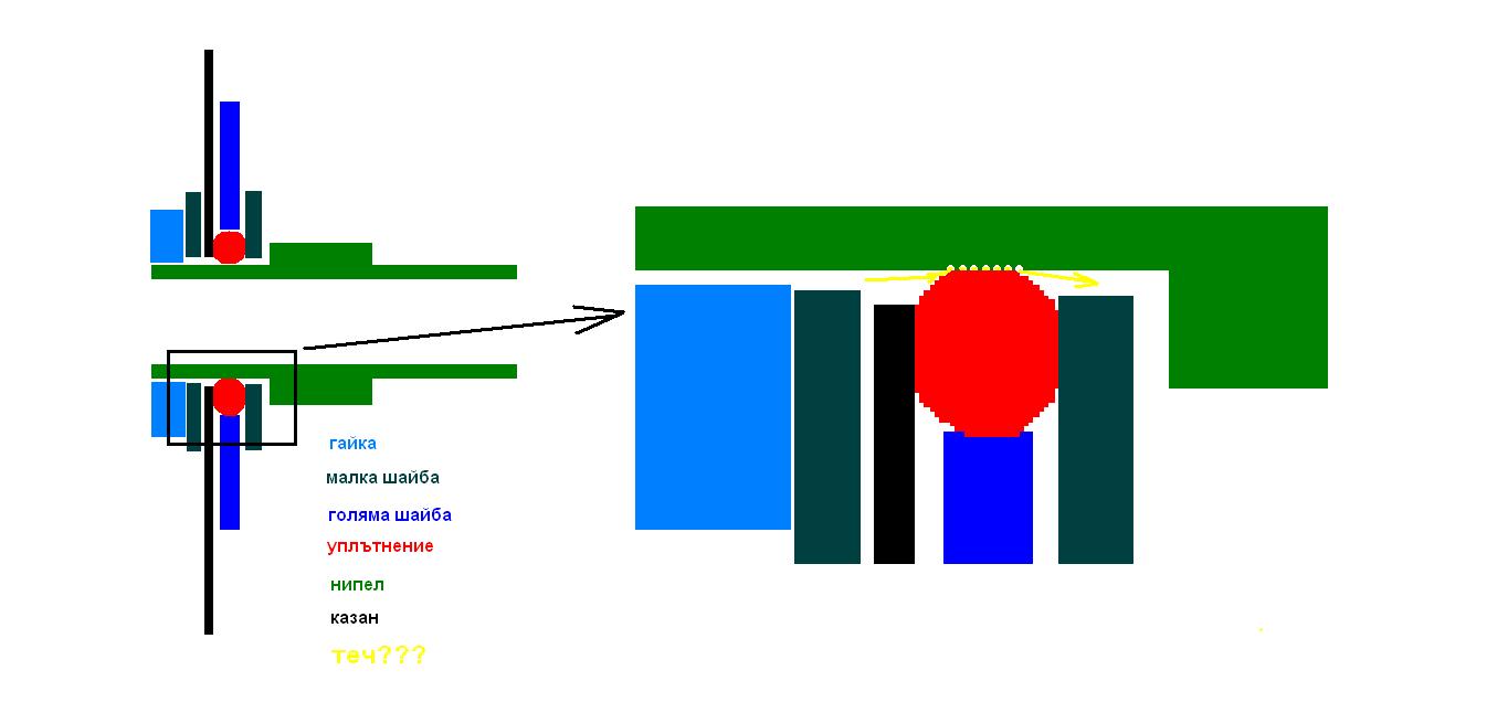 Да, схемата е точно това. но не тече поради две причини: има доста тефлон по нипела, така че да запълни резбата при семеринга, и след като се завие гайката се сплесква семеринга. Обаче понеже я има голямата шайба, тя и пречи да се разшири навън, в резултат на което тя се сплесква по посока на нипела и уплътнява. Това всъщност е основната роля на голямата шайба- да направи така че да се приплесне семеринга към нипела. Разбира се някои от връзките се случва да протекат. При нас от 16 връзки, включително двете на нагревателите които са М42 протекоха само три, като след допълнителна доза тефлон и те се оправиха. От тогава вече колко варки, миене, въртене, на заключени кранове, носене за тях и тн. нито една не е поддала.