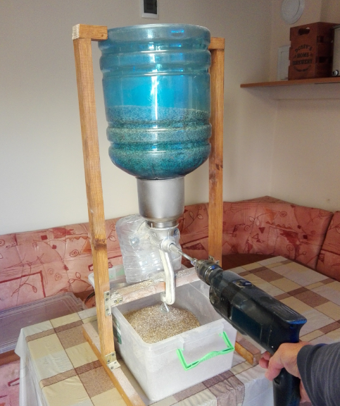 Мелницата от Виктор върши идеална работа, може да се върти на ръка, а ако на мястото на болта които фиксира дръжката се сложи обикновен болт то тогава може да се върти с винтоверт или бормашина, аз си направих и удобна стоика за мелницата и контейнер за малца, с бормашина меля 6кг. малц за 3 мин.