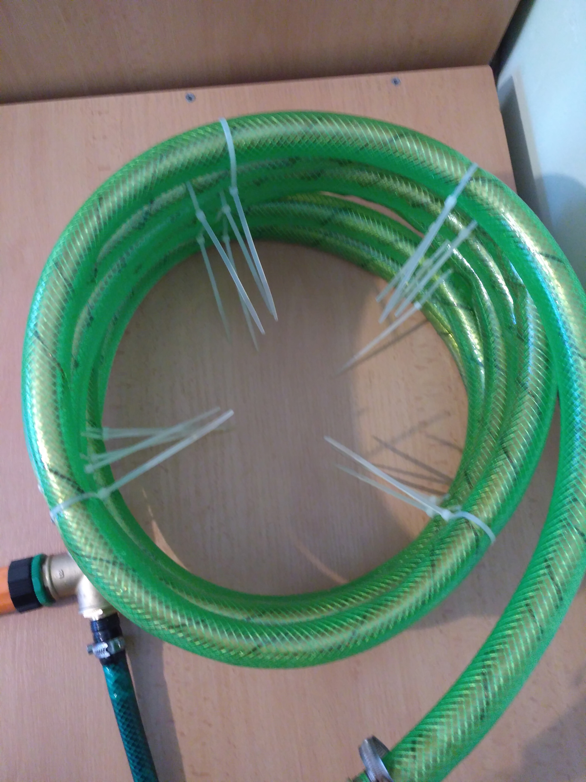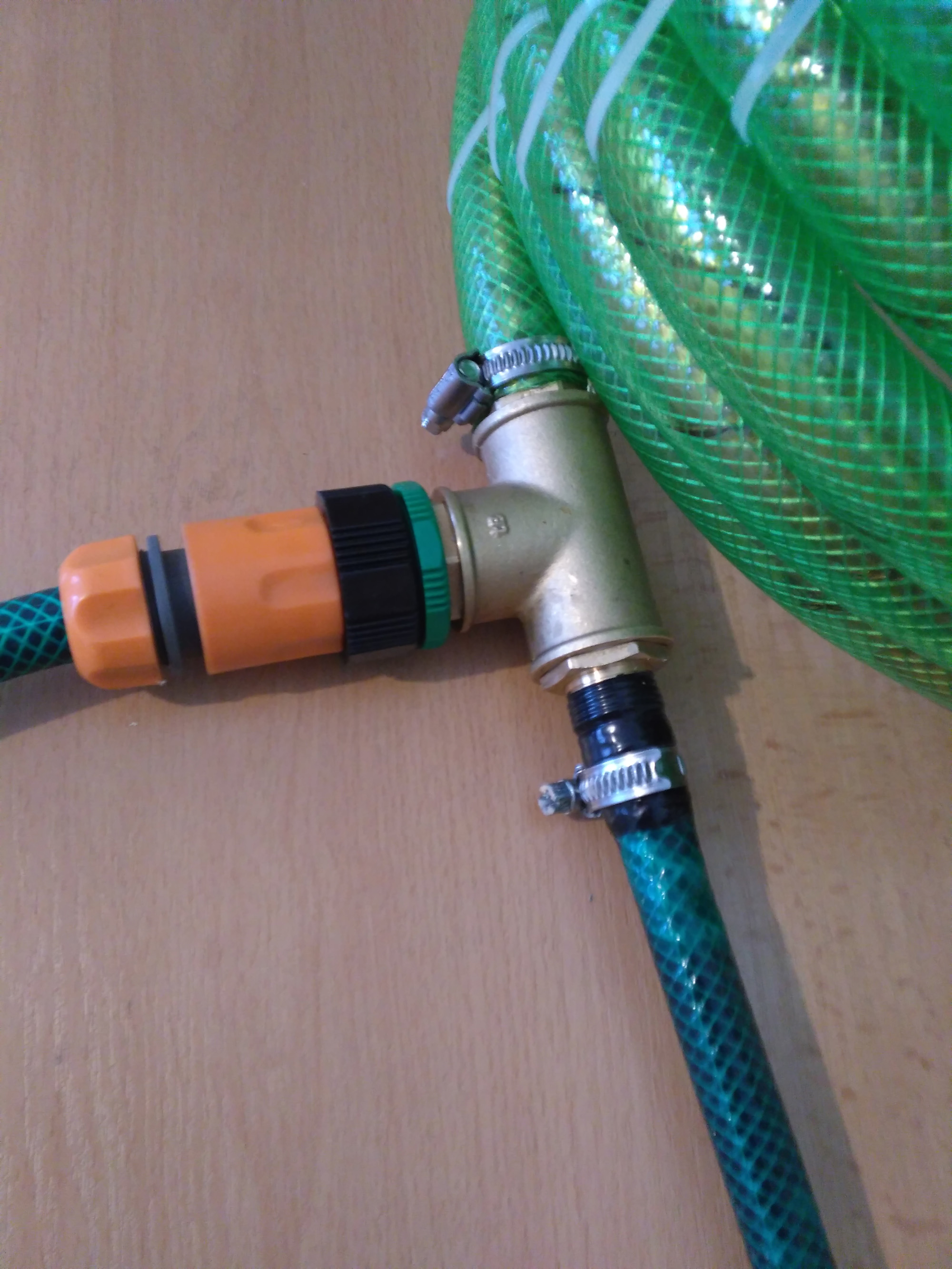 - пробвах да сложа връзка за медна тръба и на нея с нипел и редукция да сложа бърза връзка, но тва цялото протече. Махнах го и стегнах маркуча със скоба - префектно е!