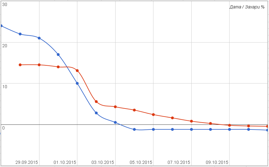 Синята графика е на 150л съд, а червената на 60л, като и двата не са пълни догоре.