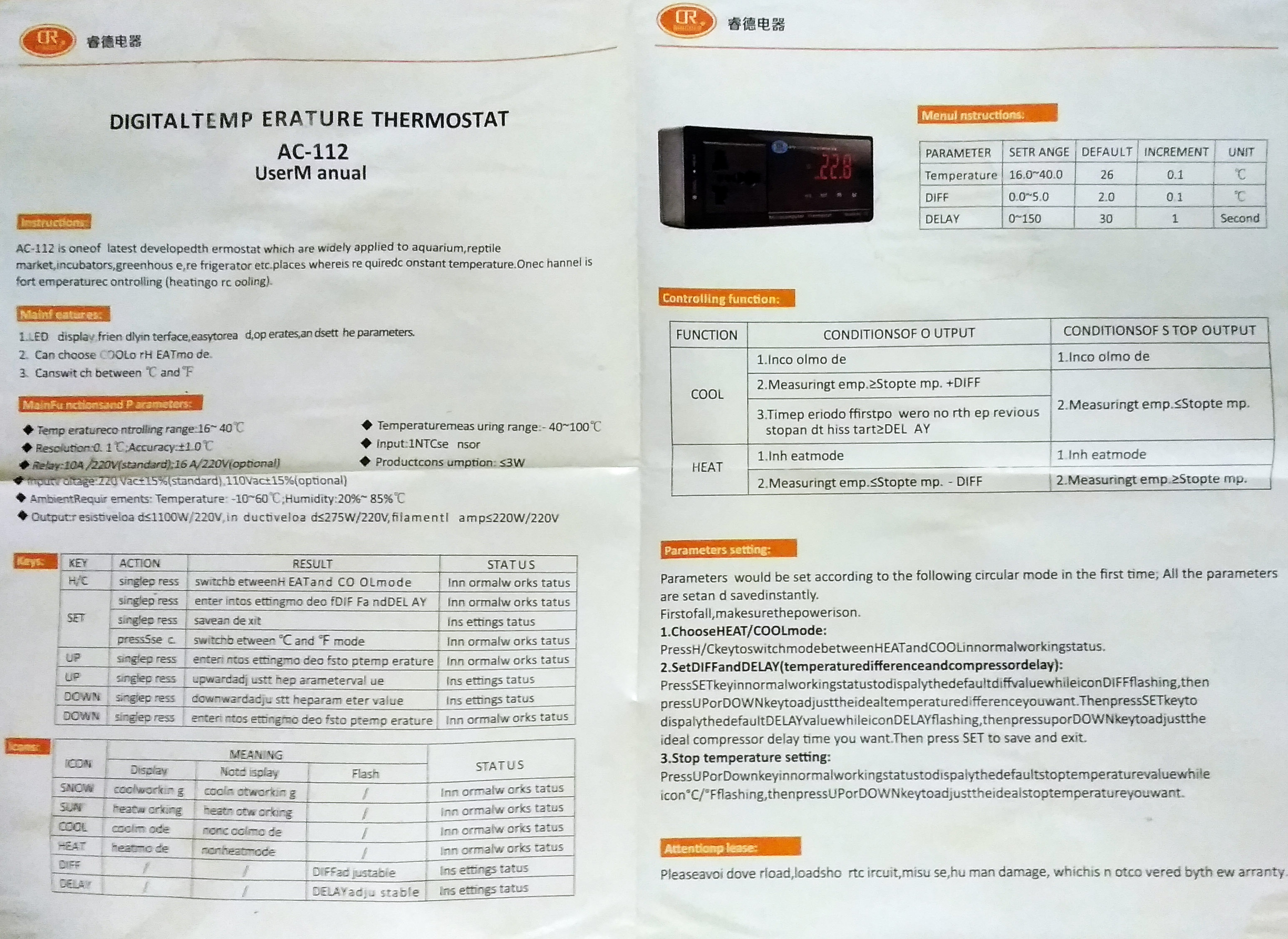 Temperature controlling range: 16-40°C
