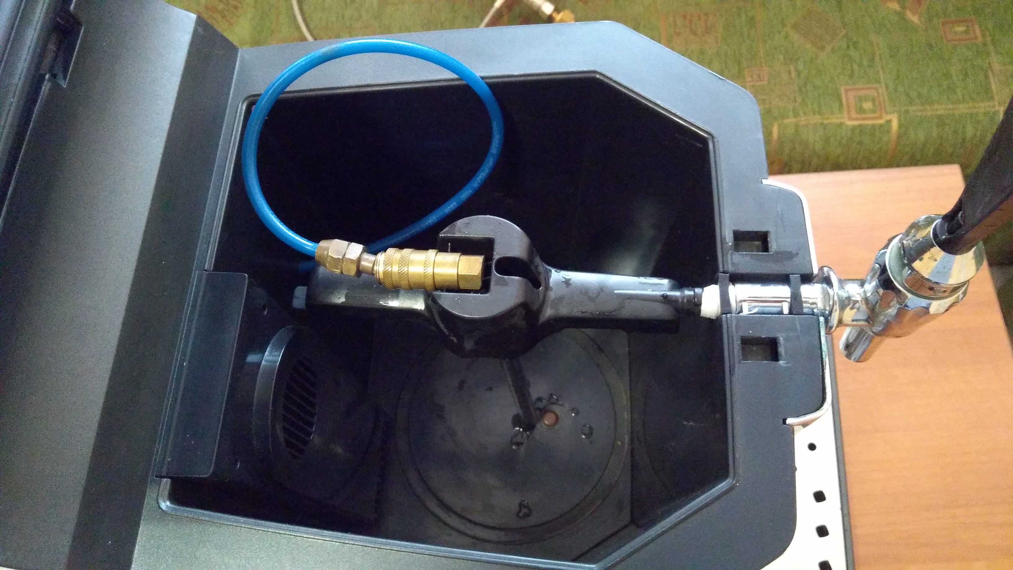 Работи на 12 и на 220 волта. Има вградени термометър и манометър. Налягането може да се регулира.