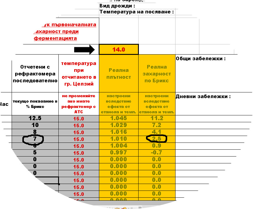 Както е видно от картинката - рефрактомерът показва 7% Брикс , вписваме в таблицата горе - начален екстракт 14% и в дясно излиза реалната текуща стойност - 2.5%