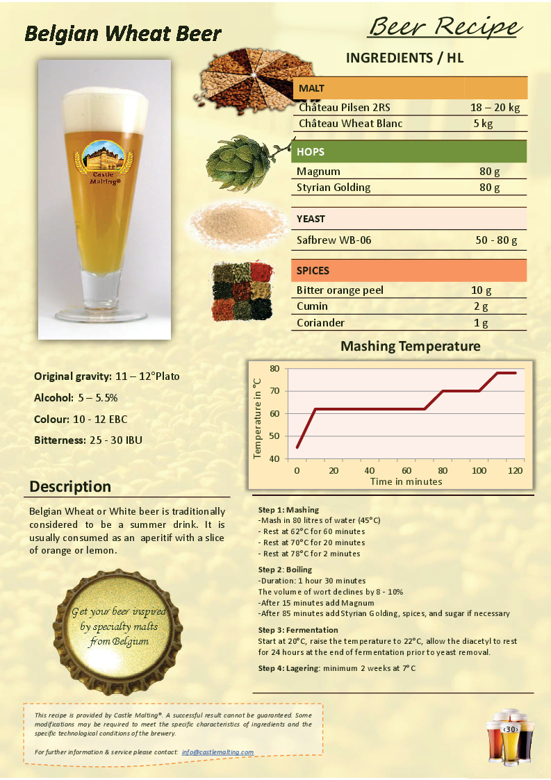предлагам ви една рецепта за белгийска пшенична бира с подправки. Оригинална рецепта е от брошурата на малцерая Castle Malting и е за 100л (1хл).